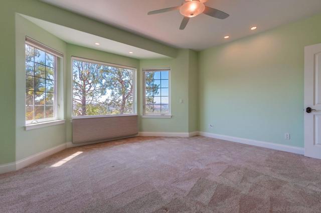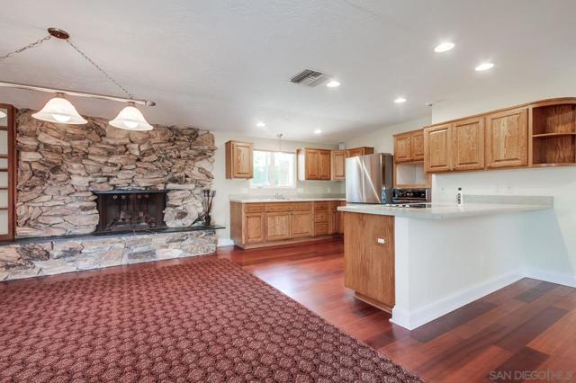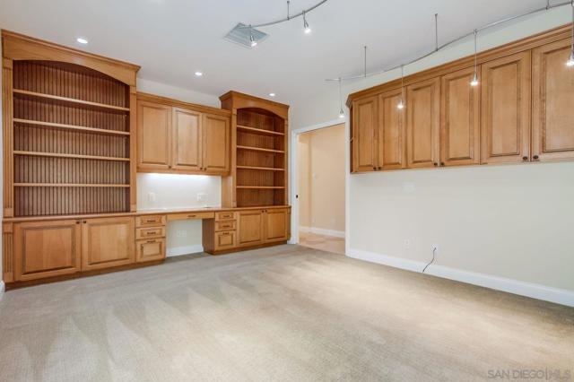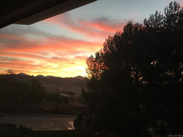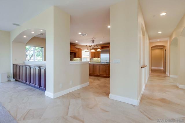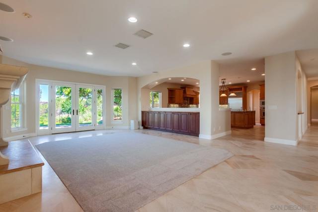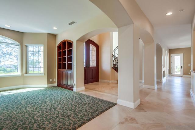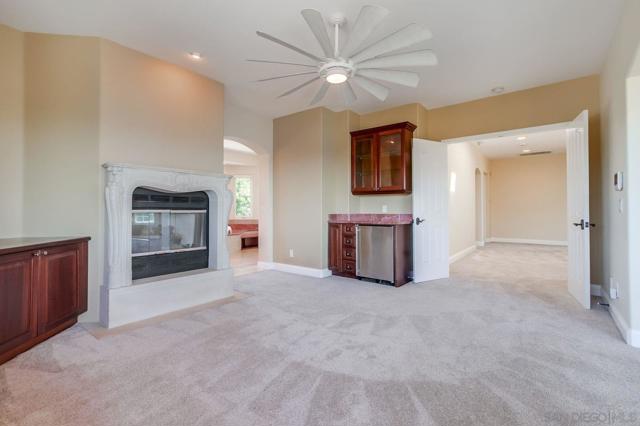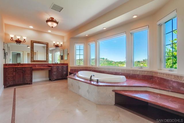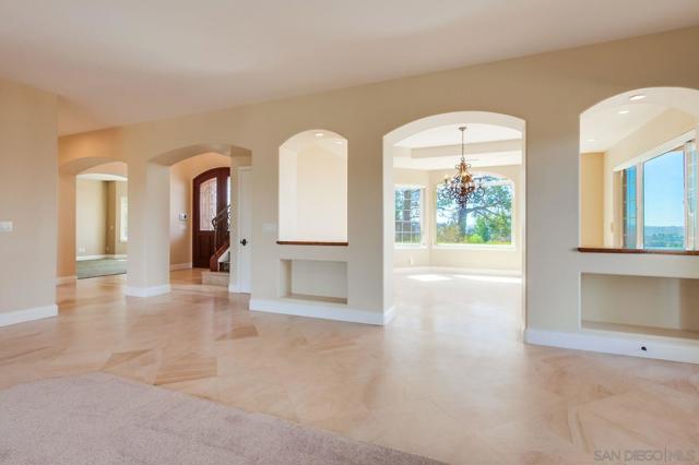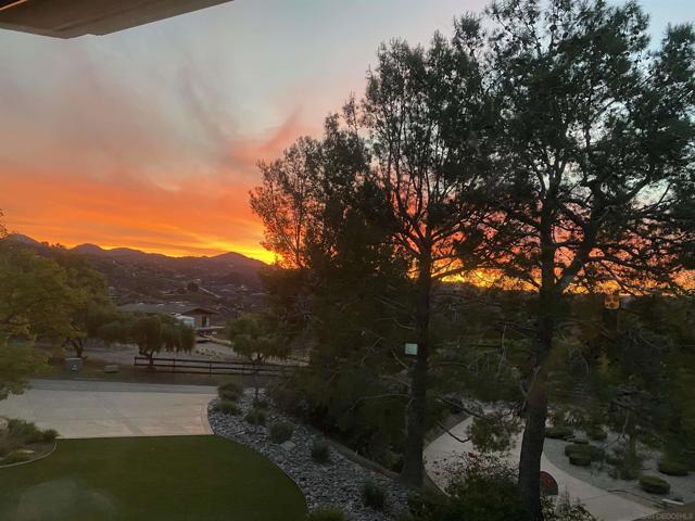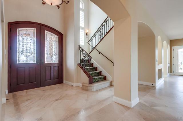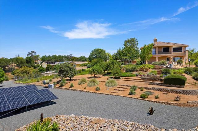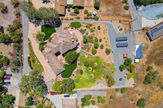 Constructed in 2004, this Mediterranean estate sits on 1.37 elevated acres in Poway with panoramic hill and valley views from virtually every room. The 5,595 sq ft residence includes a fully independent one-bedroom guest flat, a three-car garage, owned solar panels with Enphase battery backup, and grounds that encompass an ornamental koi pond, citrus orchard, terraced gardens, outdoor kitchen and gas fire pit. The level of craftsmanship, systems infrastructure, and thoughtful design throughout is exceptional. The chef's kitchen centers on a massive blue-green granite island with Miele appliances throughout, including built-in column refrigerator and freezer, a hand-carved range hood above an LP gas cooktop, and an artist-painted tile backsplash mural. The formal dining room wraps on three sides with curved windows framing unobstructed hill and valley views. A sweeping curved wrought iron staircase anchors the limestone entry foyer. Upstairs, the master suite includes a sitting room with fireplace and wet bar, a wraparound private terrace, an imported Rosso marble bath with soaking tub positioned before a bank of hill-view windows, a travertine walk-in shower, and a walk-in closet. Secondary bedrooms each have private baths and walk-in closets. A stone LP gas fire pit and citrus grove complete the outdoor program. A broad motor court accommodates eight or more vehicles. The wine cellar features 400-plus bottle redwood racking, dual built-in wine refrigerators, and a secondary storage room accessed through a speak-easy door.