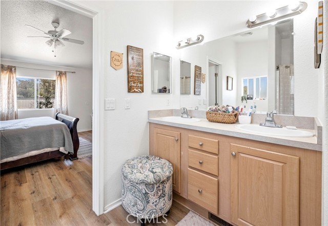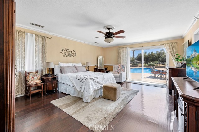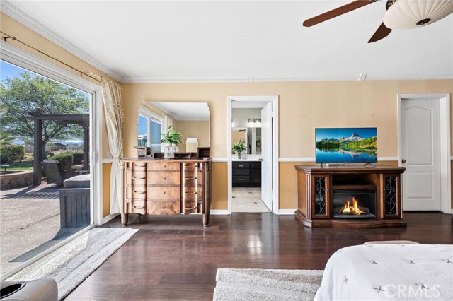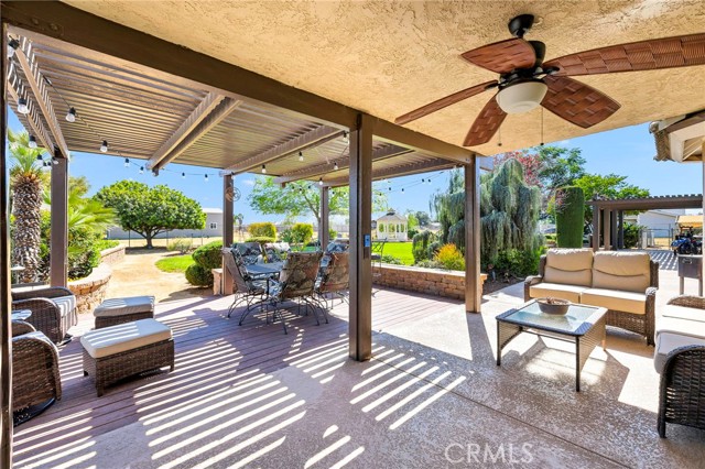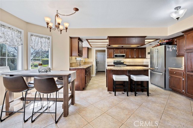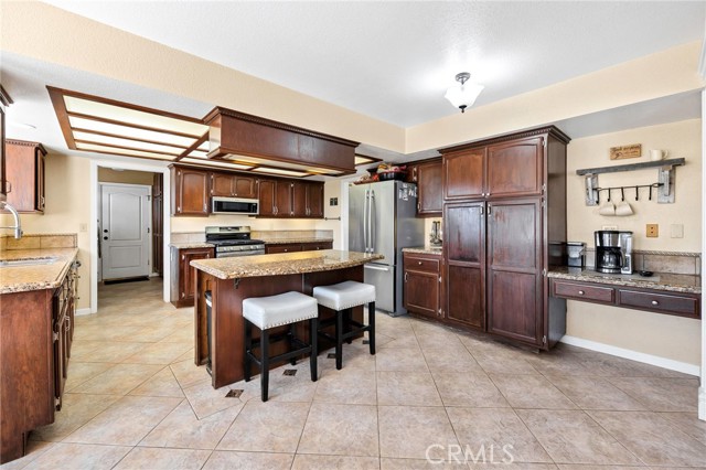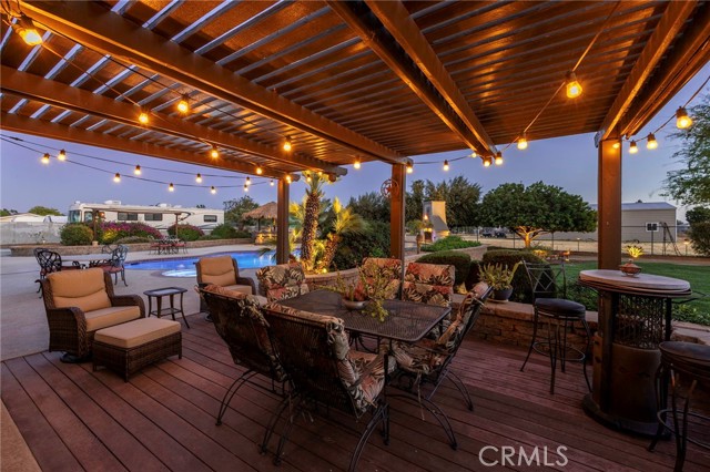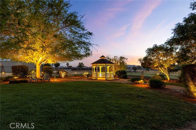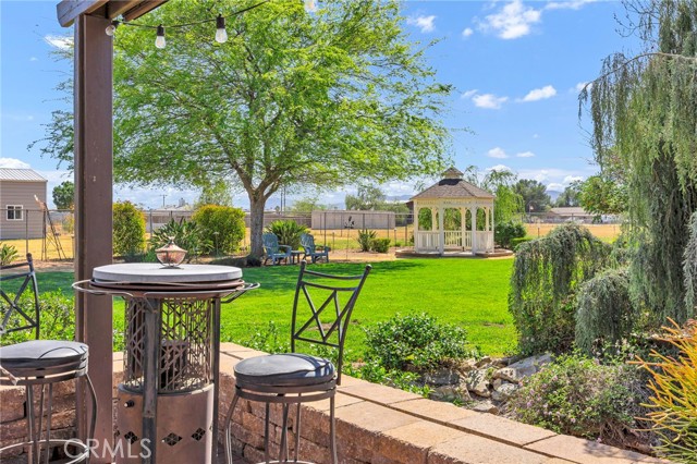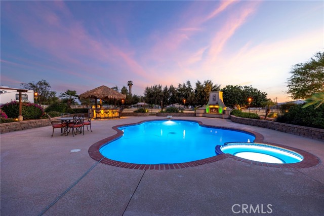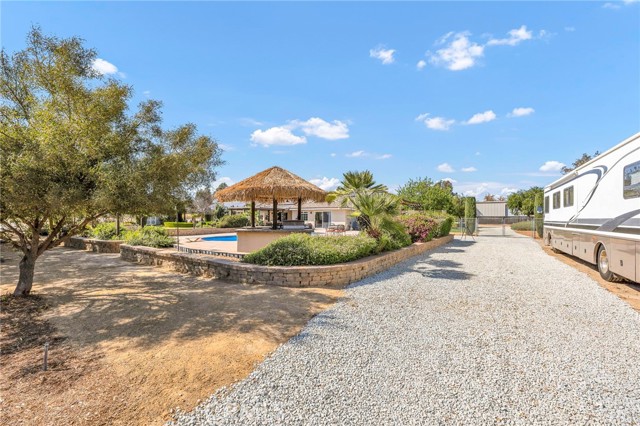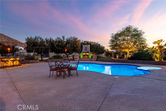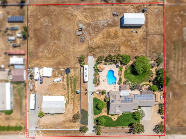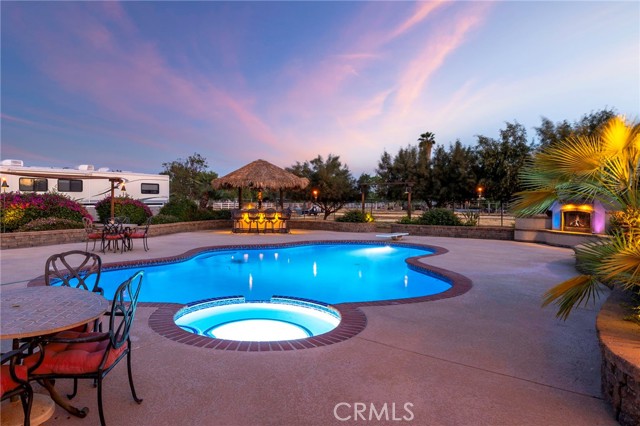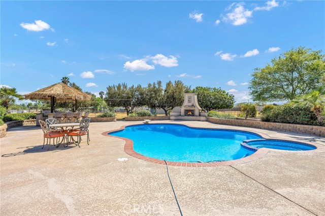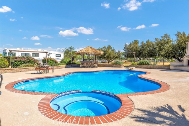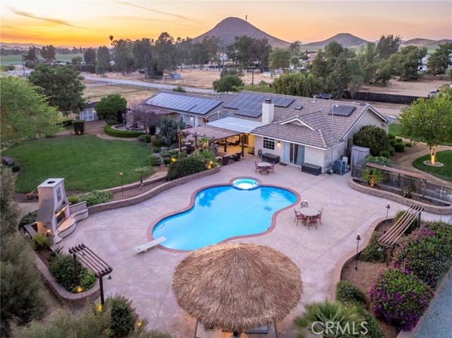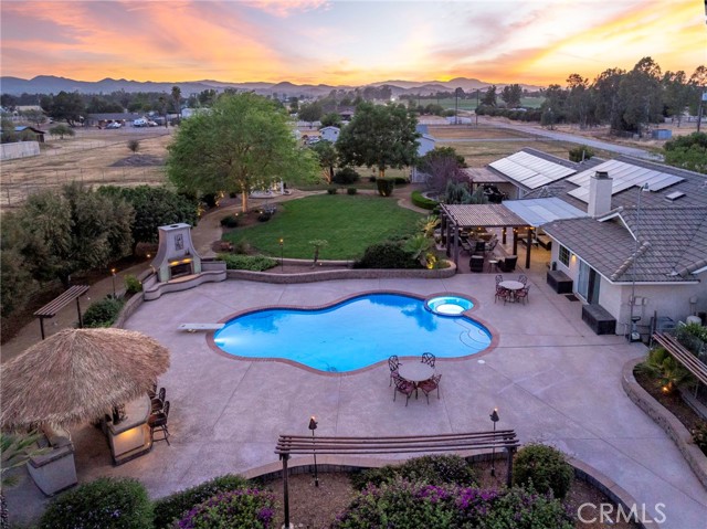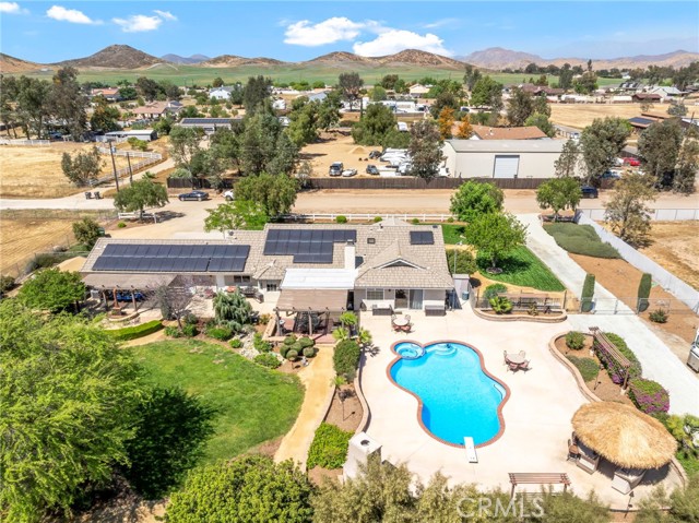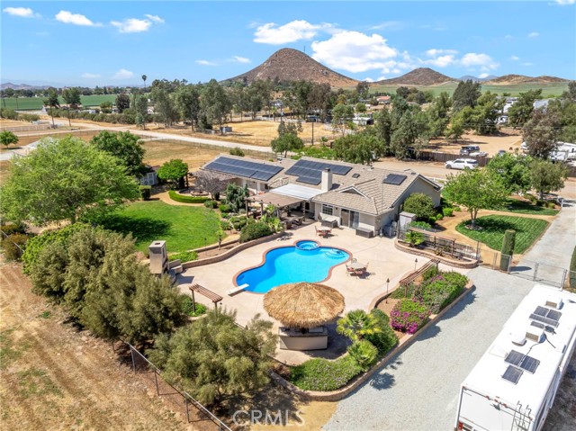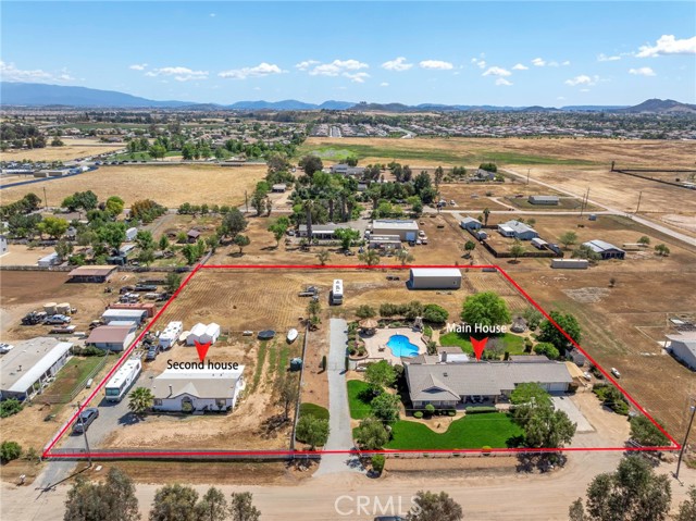 Welcome to a rare opportunity in the heart of Menifee—2 HOMES on one beautifully maintained 2.26-acre lot, offering the perfect blend of luxury, functionality, and versatility. Whether you’re seeking multi-generational living, rental income, or space for your ranch lifestyle, this exceptional property delivers. The main residence is a single-story ranch-style home offering approximately 2,459 sq. ft., featuring 4 bedrooms and 2.5 baths. Inside, you’ll find a large formal living room with an adjoining dining room, ideal for gatherings, along with a warm and inviting family room with wood-beamed ceilings and a wood-burning fireplace. The kitchen is filled with natural light and offers abundant cabinetry, granite countertops, and a charming breakfast nook—blending classic ranch style with everyday functionality. The spacious primary suite offers direct access to the pool, while the updated primary bath provides a spa-like retreat with a beautifully designed shower. Three additional guest bedrooms and a full bath complete the home. Additional highlights include a 3-car garage, paid-off solar, and a 700-ft deep well. The grounds are thoughtfully designed with professional landscaping and outdoor lighting, creating a private resort-style setting. Enjoy endless entertaining with a sparkling pool and spa, expansive covered patio, gazebo, and an outdoor kitchen complete with bar seating and a charming palapa cover. Additional features include an 28x48 RV garage, separate RV/trailer parking with gated access, storage shed, and ample space for animals. The property is fenced and crossed fenced. The secondary home offers approximately 1,280 sq. ft. with 3 bedrooms and 2 baths, ideal for extended family or income potential. This home features an open floor plan with LVP flooring throughout, a cozy fireplace in the family room, indoor laundry, covered patio and its own separately fenced yard with private gated entrance. A truly unique property combining comfort, privacy, and endless possibilities—all in a prime Menifee location close to shopping, dining, schools and everyday conveniences and LOW TAXES!
