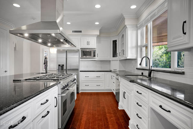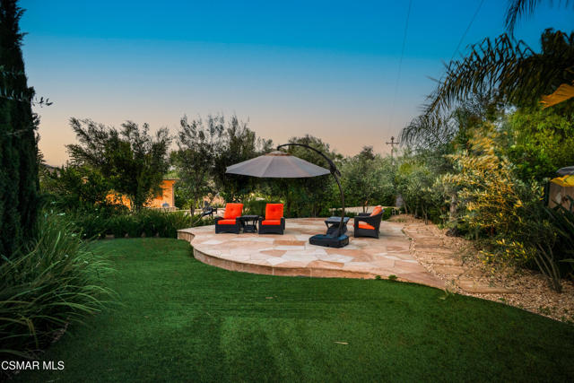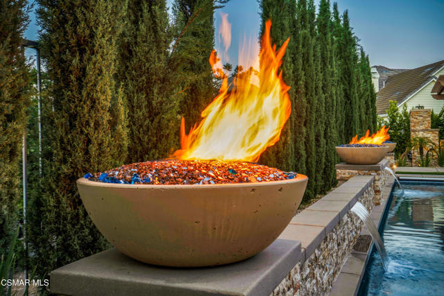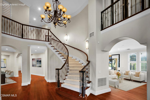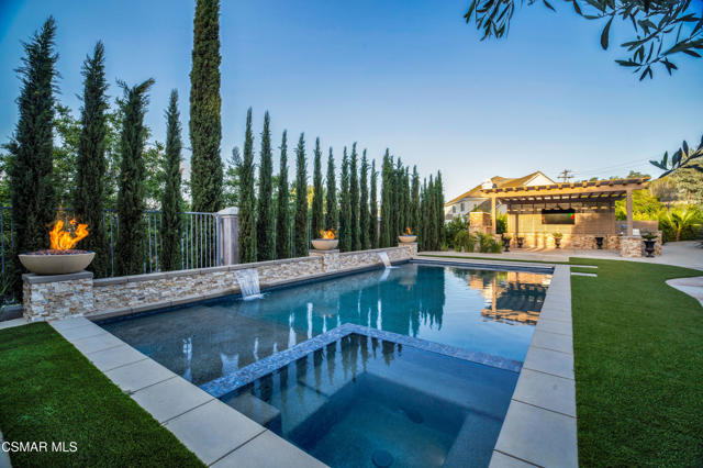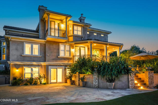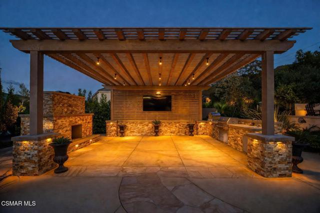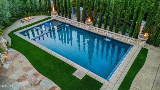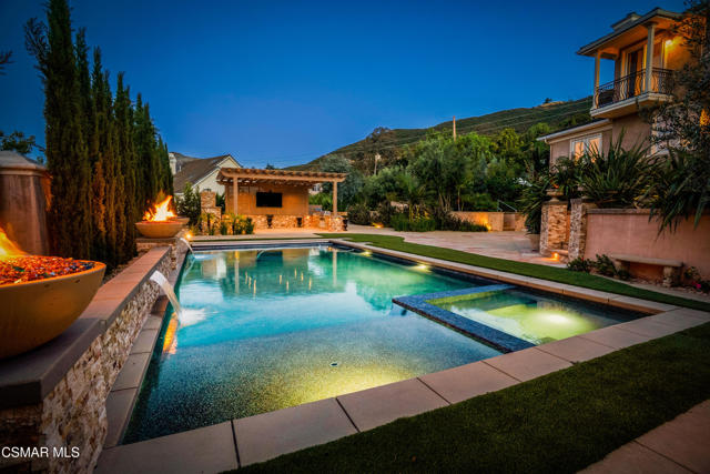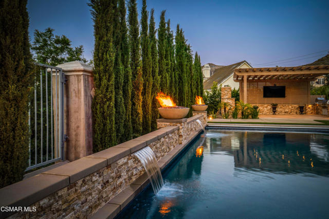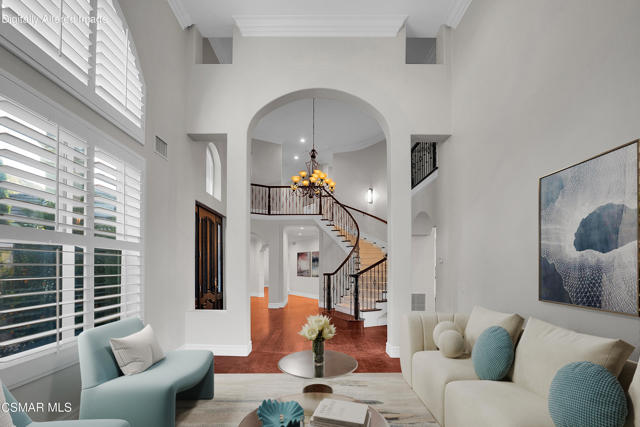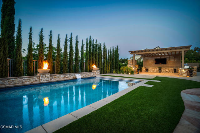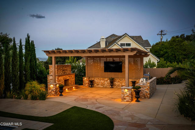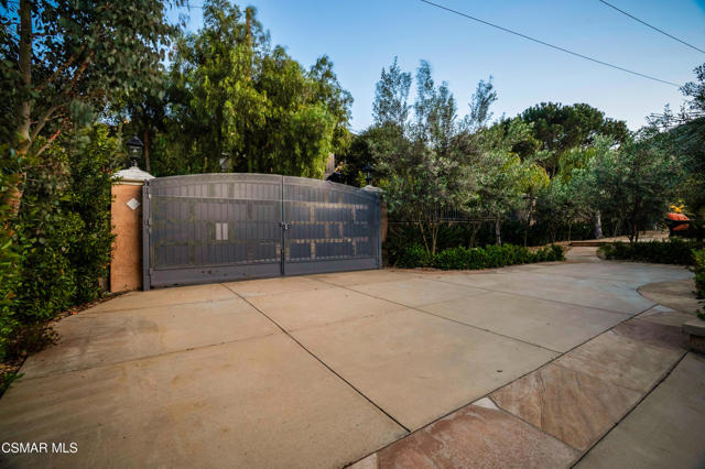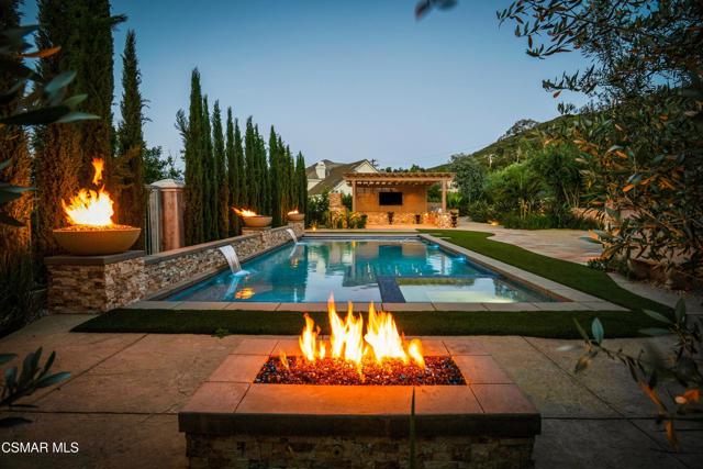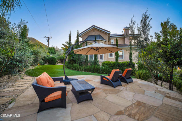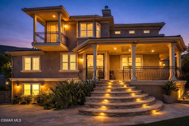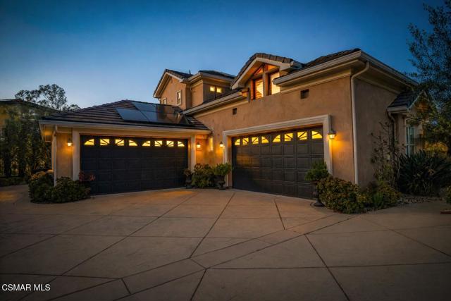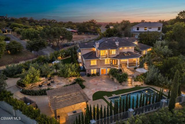 Rare opportunity to own a truly exceptional 4,137 sq ft gated Mediterranean-style estate nestled on a sprawling 29,273 sq ft lot with sweeping views of the Conejo Valley. From the moment you enter, the home impresses with dramatic volume ceilings, stunning architecture, an elegant curved staircase with wrought iron detailing, and an abundance of natural light streaming through expansive windows adorned with plantation shutters. Rich hardwood flooring, refined crown molding, and thoughtfully designed living spaces create a warm yet sophisticated atmosphere throughout.At the heart of the home, a beautifully appointed chef's kitchen blends style and functionality, featuring high-end stainless-steel appliances, granite countertops, custom cabinetry, a generous center island, and a walk-in pantry. The kitchen opens seamlessly to the inviting family room, making it ideal for both everyday living and entertaining.Designed with flexibility in mind, the home includes a private lower-level guest suite with its own entrance, kitchenette, bathroom, and laundry, perfect for guests, extended family, or multigenerational living. Upstairs, the primary suite serves as a luxurious retreat, complete with a fireplace, dual walk-in closets, a spa-like bath with soaking tub & glass-enclosed shower, and a private veranda capturing peaceful valley views.Step outside to a resort-inspired backyard designed for ultimate enjoyment. Multiple patios and outdoor living areas surround a sparkling saltwater pool and spa, while a spacious gazebo/pavilion offers a built-in BBQ, pizza oven, fireplace, and lounge space--ideal for hosting or relaxing in style. The grounds are beautifully landscaped with drought-tolerant plants, turf, and fruit trees, creating a private and serene setting.Additional highlights include a 4-car attached garage with direct access, extra driveway parking, RV access gate, owned solar system, dual-zone HVAC, tankless water heater, and a bonus room above the garage offering added storage or flexible use space. Conveniently located near parks, trails, top-rated schools, and shopping, this distinctive property offers the perfect blend of luxury, comfort, and lifestyle.
