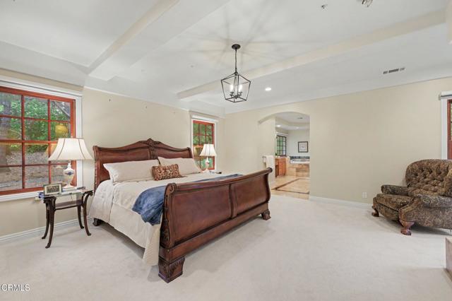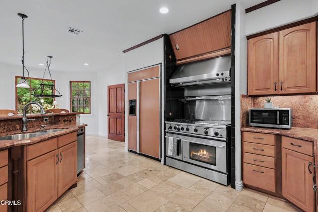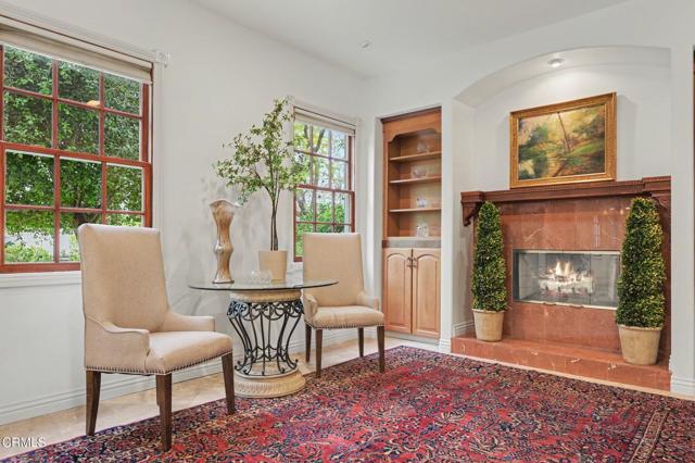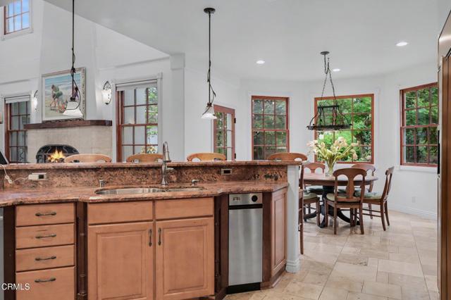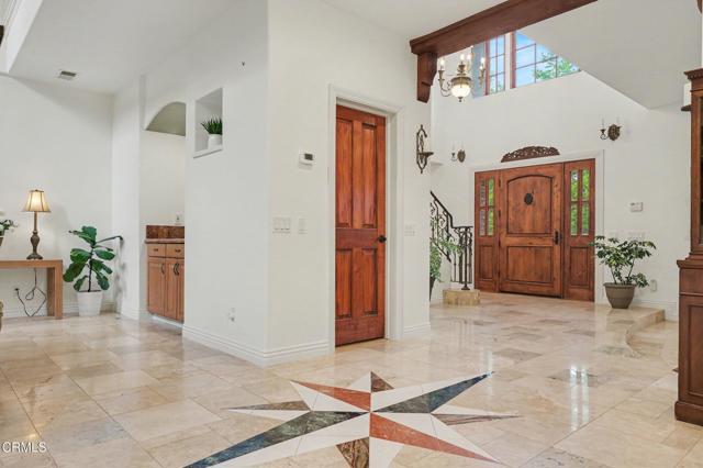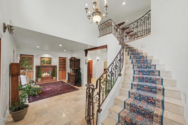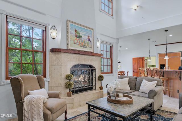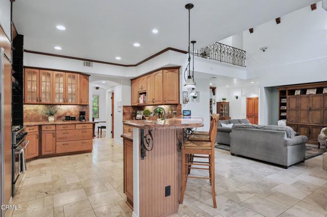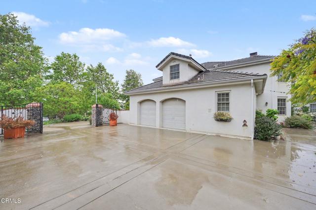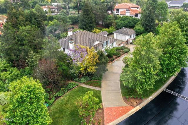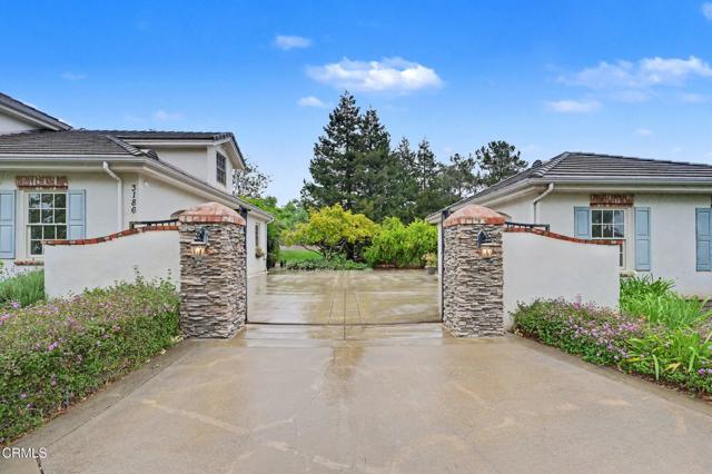This extraordinary 5 bed, 4.5 bath custom estate is located on over an acre of land in Bella Vista, one of Ventura County's most desirable gated communities. Designed with both flexibility and everyday living in mind, the home features a highly sought-after primary suite on the main level, along with a spacious downstairs family room--ideal for single-level living if desired. The primary suite includes its own fireplace, a large walk-in closet, and an en-suite bath with custom vanities and a Jacuzzi tub. The lower level showcases a dynamic, open-concept layout with a double-height vaulted family room that flows into the kitchen. The kitchen features a large breakfast bar with seating for four, a breakfast nook, ample storage, and a walk-in pantry, and connects to the formal dining room overlooking the front landscaping. A separate formal living room with a fireplace provides an additional gathering space. Upstairs, four additional bedrooms are complemented by a versatile loft-style bonus space, perfect for a playroom, office, or additional lounge area, complete with its own window and generous attic storage.Outside, the grounds are a standout feature, with mature landscaping and a variety of fruit trees blooming for your enjoyment. The backyard includes an extensive built-in barbecue area and a large open space that can accommodate a pool, spa, pickleball court, or outdoor events. The property includes both an attached two-car garage and a detached two-car garage, offering flexibility for additional parking, a workshop, or office space. A circular driveway and mature front trees enhance both privacy and curb appeal. Located in Camarillo, Bella Vista offers convenient access to nearby golf courses including Las Posas Country Club, Sterling Hills, and Spanish Hills, as well as easy access to both Los Angeles and Santa Barbara.With fewer than 100 custom homes in this community, Bella Vista offers a rare sense of privacy, tranquility, and timeless appeal. Offered for the first time since its original construction, this home presents a unique opportunity in a highly sought-after community.
