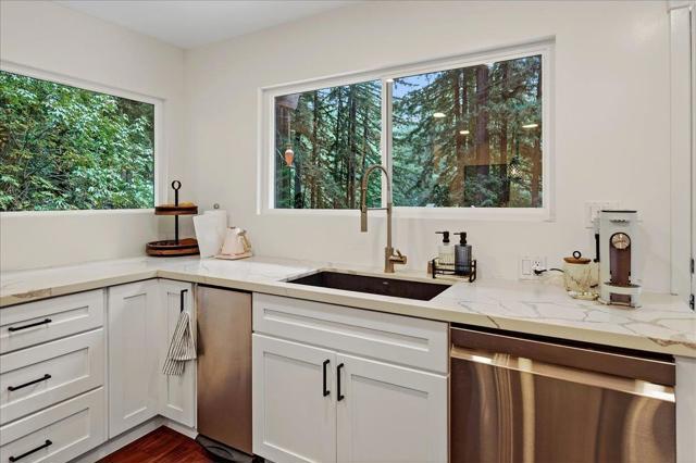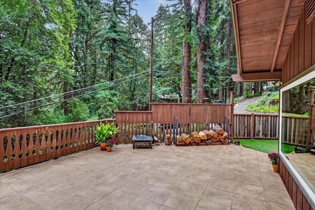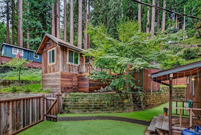 Discover your own slice of paradise in the Los Gatos Hills. This enchanting property features 2 bedrooms plus office, 1.5 bathrooms and a separate studio, backing to pristine forest and trails. The light-filled living room features a dramatic wall of windows opening to a large, sunny deck, blending indoor/outdoor living. Beautifully updated gourmet kitchen shines with custom wood cabinetry, a center island, new LG appliances, including a double oven and gas range, and a large walk-in pantry with washer and dryer. The tranquil primary suite includes walk-in closet and a tiled shower bathroom. A second bedroom and dedicated office provide versatile space. Outside, you'll find a restored original mtn cabin for guests, art room gym or home office. Enjoy the private deck overlooking the lush forest and Los Gatos Creek, providing a serene escape and hiking into the watershed below. Home is equipped with a tesla power wall and has been updated throughout including new roof. Comcast internet available. Friendly community offers hiking trails, a playground, and a clubhouse. Prime location minutes to downtown LG, close to Lexington Reservoir, with best Los Gatos schools featuring Lexington Elementary (International Baccalaureate Program), Fisher Middle and Los Gatos High.
