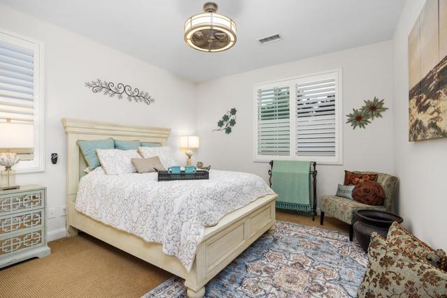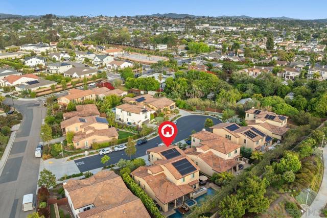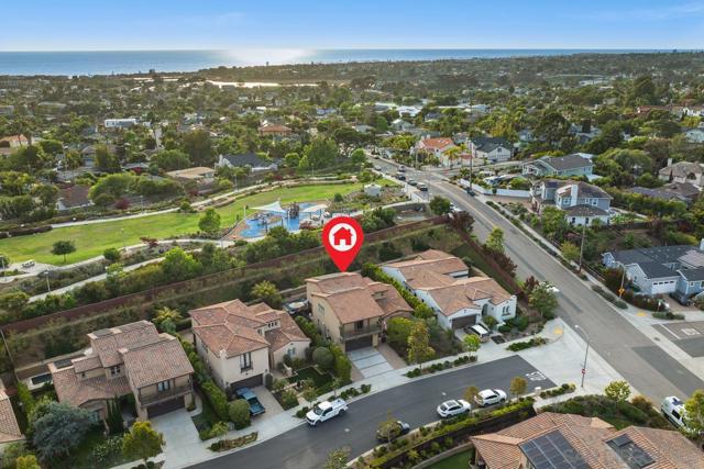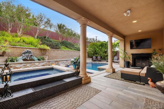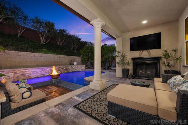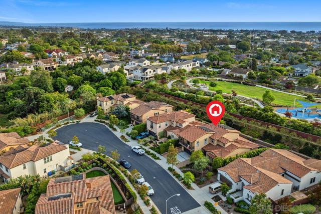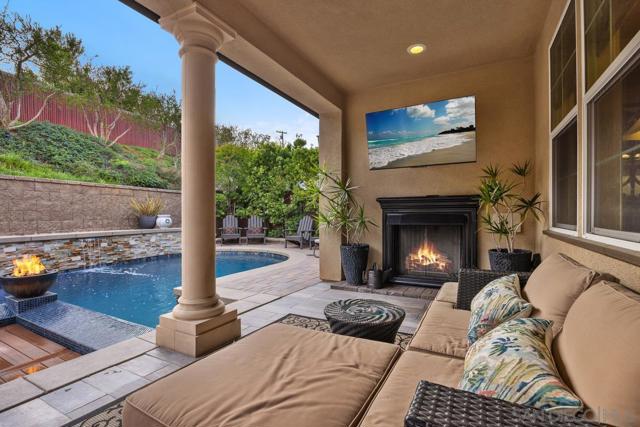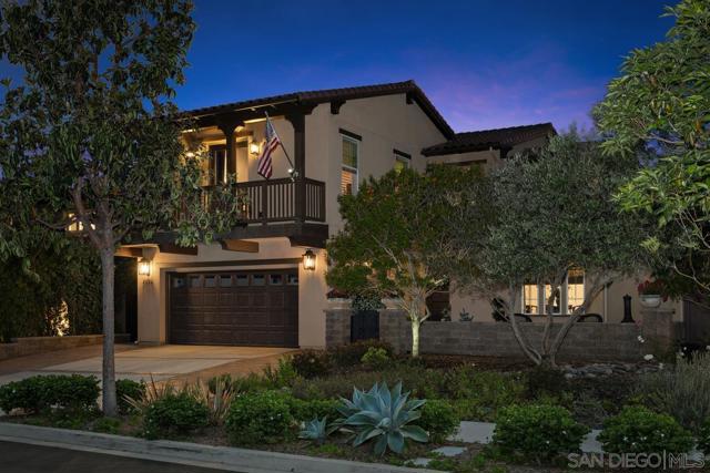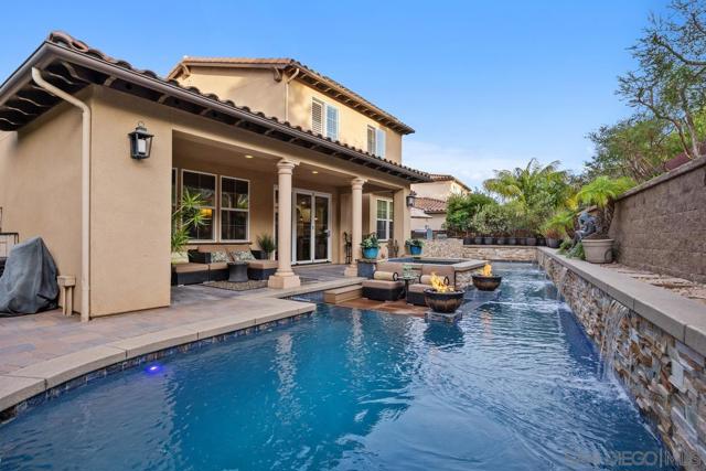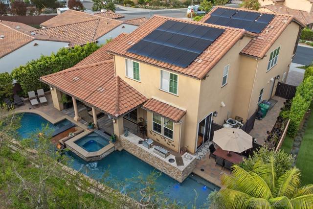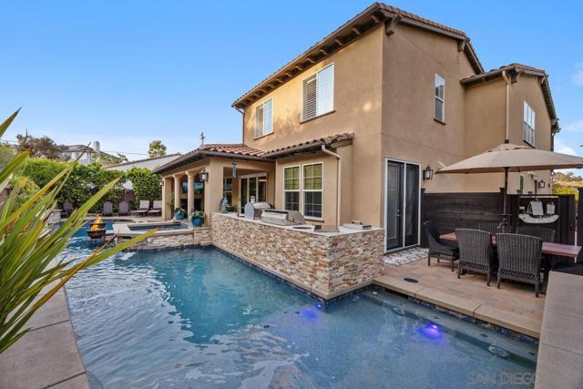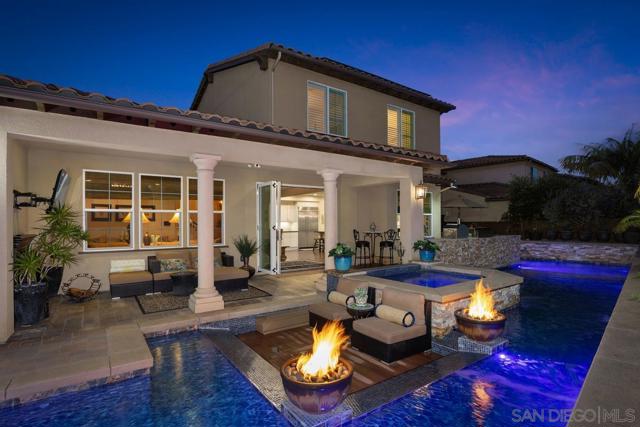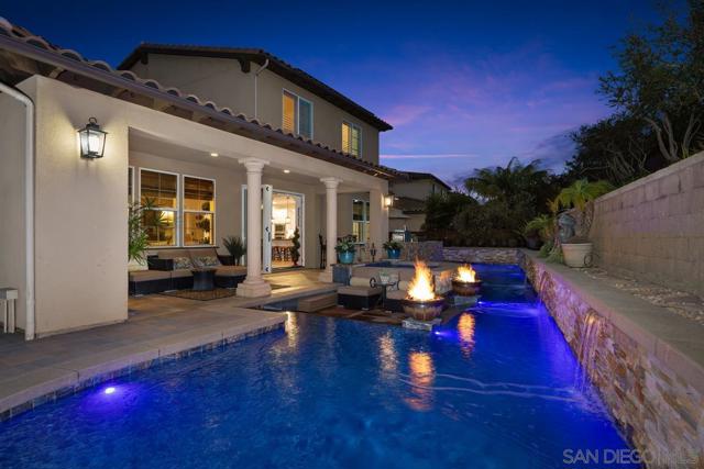 Enjoy relaxed coastal living in this beachside community of Carlsbad West. This very private home features a resort style backyard with a custom pool, lounge area, and jacuzzi. Enjoy the water features and fire boxes from your spa for that perfect zen experience. The stacked dining room door provides a seamless transition whether you are dining indoors or al-fresco. The Chef's kitchen is appointed with abundant storage, stainless steel appliances, built in refrigerator, trash compactor, and a fantastic island for extra seating. The open concept main living areas takes full advantage of the resort feeling of this home. The first floor ensuite bedroom with a walk in closet could be used as a second primary bedroom. The upstairs Primary bedroom with a private balcony and luxurious bathroom create a restful sanctuary. The two additional bedrooms also have walk in closets and share a full bath. The loft area upstairs provides a nice space for reading or just lounging. The laundry room is located directly off the garage and has a utility sink and storage. The garage has a charging station and epoxy flooring. The solar is included and owned. The Buena Vista Reservoir Park is located directly behind this home and has a panoramic ocean view.