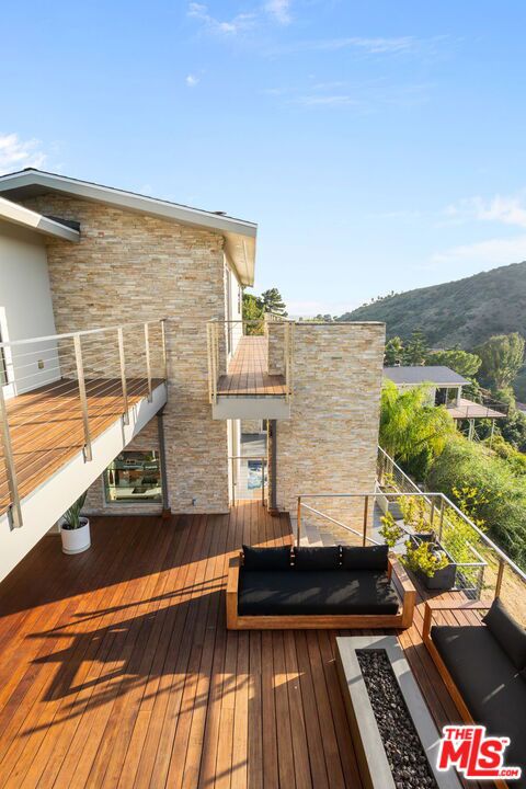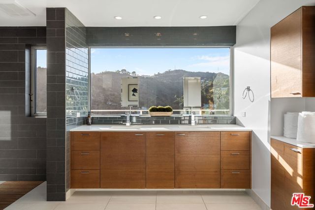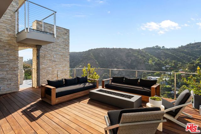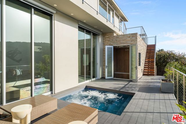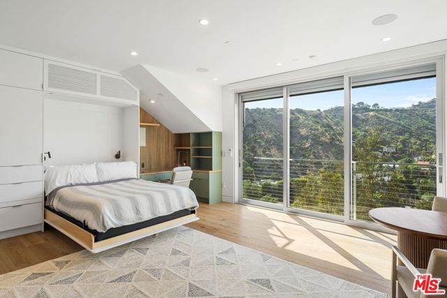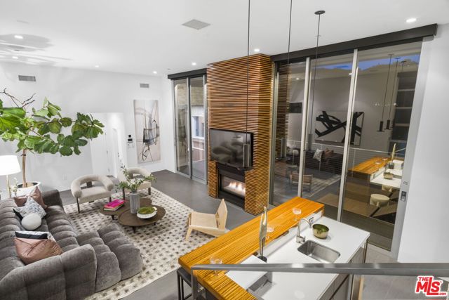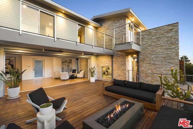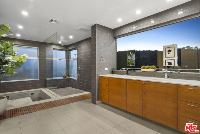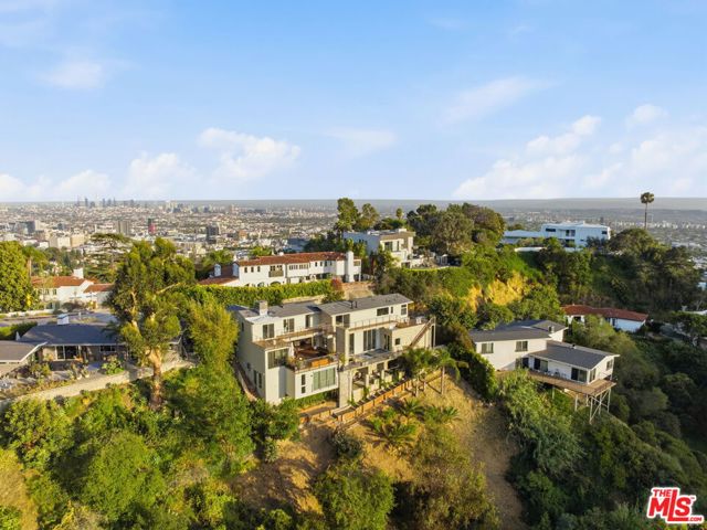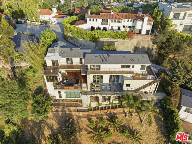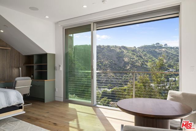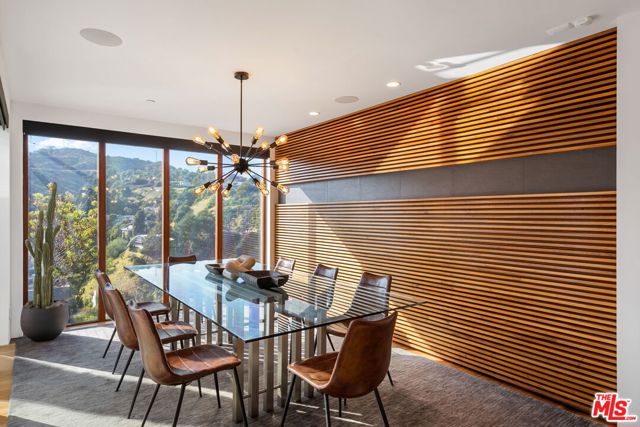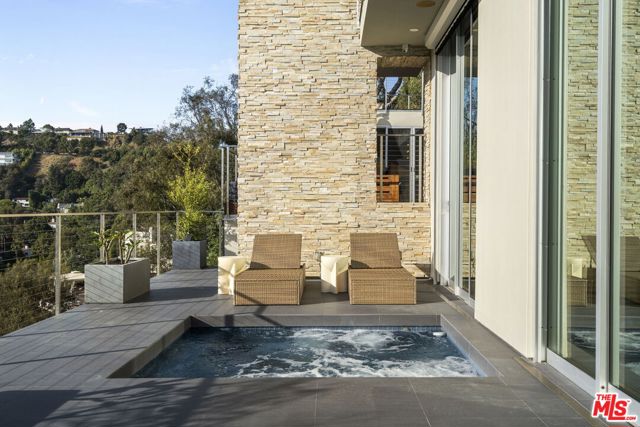 Positioned high above the canyon in the Hollywood Hills, this striking contemporary residence delivers the scale, presence, and seamless indoor-outdoor lifestyle expected at the upper tier of the market. Architecturally intentional in its design and further elevated by the current owners through targeted enhancements, the home offers a level of livability and entertaining capacity that meaningfully distinguishes it from its peers. Walls of Fleetwood stacking and pocketing glass sliders define the experience, dissolving boundaries between interior living spaces and expansive terraces that capture sweeping canyon views from nearly every room. A six-panel Fleetwood system at the main level disappears entirely, transforming the home into a true extension of its surroundings and creating a resort-like environment equally suited for intimate evenings or large-scale gatherings. The dining room, anchored by a custom inlaid wood panel wall, sits at the edge of home featuring floor-to-ceiling windows that create the sensation of floating above the canyon while you dine. Across the home in the media room, complete with a built-in bar and dramatic high ceilings, this same custom woodwork, paired with integrated slate finishes that extend from inside to out, introduces warmth and permanence grounding the modern architecture in a refined, timeless material palette. The media room, complete with a built-in bar and dramatic openings, serves as a central entertaining hub with direct access to the sunken plunge pool and spa, as well as the surrounding decks. A newly added steam room introduces a spa-caliber experience, positioned with direct access to the main deck and oversized hot tub designed to function as both a rapid-heat spa and a cold plunge. The transition between these elements creates a cohesive indoor-outdoor wellness environment. From the spa level, an exterior staircase leads directly to the primary suite, where a Japanese-inspired soaking tub and expansive walk-in rain shower complete the experience. Outdoor living has been executed with precision and intention. Multiple terraces, a high-output fire pit, and ceiling mounted heating elements allow for year-round usability of the outdoor spaces. A professionally installed motorized retractable screen system encloses the large Fleetwood openings at the touch of a button, preserving the open-air experience while enhancing comfort, climate control, and functionality for the days you prefer to stay inside while still taking in the fresh breeze. Smart home integration implemented by the current owners includes Lutron lighting, distributed audio, MyQ garage control, AquaLink spa management, ADT security hardware, numerous closed circuit security cameras, DoorBird, Shade Store motorized shades, and four-zone climate control (two gas and two electric systems). Additional upgrades include tankless water heaters, a new roof (2025), Toto heated bidet toilets on both levels, custom garage cabinetry, and multiple 220V charging outlets. Completed in 2023, the ADU expands the property's functionality with a separate entrance, full kitchen, laundry, and a 120-inch 4K projection system. A three-panel Fleetwood sliding panel system with a motorized retractable screen connects the space to the outdoors seamlessly, creating a flexible, design-forward environment ideal for guests, extended stays, or income potential. Both the main kitchen and the ADU feature Wolf and other luxury appliances and Fisher & Paykel dual-drawer dishwashers, reflecting a consistent level of finish throughout. The ADU further includes its own washer and dryer along with a full-size EuroCave wine refrigerator. With its combination of architectural scale, premium materials, and thoughtfully executed enhancements, this residence offers a level of presence, functionality, and experiential living that firmly supports its position within the upper echelon of the Hollywood Hills market.