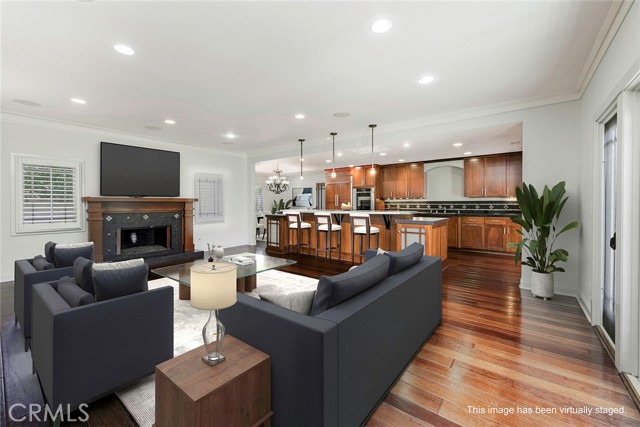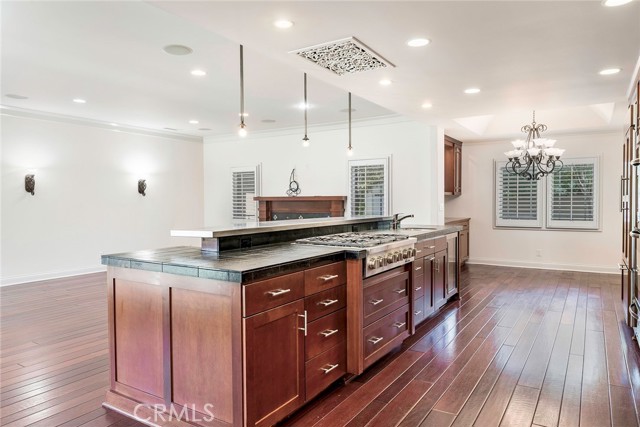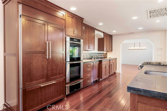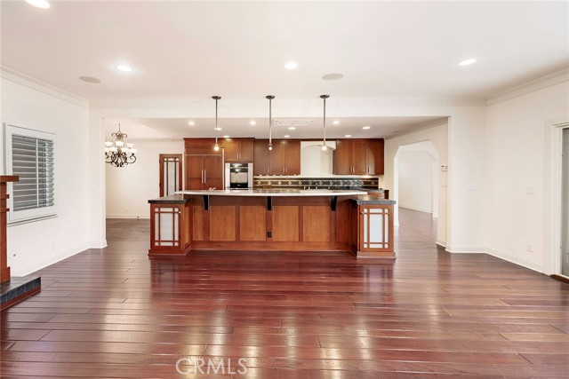 Welcome to a Truly Beautiful Craftsman Style Home in the Center of Rossmoor. This 3 Bedroom 2.5 Bath Home Features both Formal Settings as Well as an Open Floor Plan Concept for Todays Active Lifestyle. Greeted by a Traditional Front Porch you Enter into the Formal Entry Foyer with Coffered Ceilings, and Hardwood Floors. The Formal Living Room Features a Custom Fireplace Mantel with Limestone Surround and Hearth. Carpet Flooring, Recessed Lights and in Wall Speakers. A Separate Formal Dining Room with Hardwood Floors and Custom Chandelier. The Entry Hall Then Leads to a Huge Open Floor Plan Great Room Space with Family Room, Kitchen and Breakfast Room. Family Room Features a Custom Fireplace with Cherry Wood Mantel and Slate Tile Surround and Hearth. Hardwood Floors, Surround Sound Speakers, Recessed Lighting, Built in Cabinets and Custom French Doors Facing the Backyard Patio. The Kitchen has a Huge Island Featuring a Unique Stainless Steel Raised Bar Service Counter for Informal Dining and Entertaining, Six Burner Dacor Gas Cooktop, Beautiful Slate Tile Counter Top, Bar Sink, Wine and Beverage Built in Refrigerator. Dacor SS Double Oven and Warming Drawer, Bosch Dishwasher, and 42 in Refrigerator. Beautiful Custom Natural Cherry Wood Cabinets with Self Closing Hardware. Separate Step in Pantry. The Breakfast Room is Adjacent to the Kitchen and Family Room and Features Custom Built in Natural Cherry Wood Cabinets and Service Counter. Hall Bath Features a Cherry Finish Cabinet, Kohler Sink and Natural Stone Counter Top, Floor and Shower. Large Primary Bedroom with Carpet Flooring, Built in TV Cabinet and Dresser, Recessed Lights and Wall Sconces. Finished Walk in Closet. Beautiful Primary Bathroom, Large Soaking Tub and Walk in Shower all with Natural Stone Finishes and a Cherry Finish Vanity and Storage Cabinet. Large Covered Patio with Inlaid Brick and Stamped Concrete. Beautiful Stone Fountain and Water Feature Gas Fire Pit with Raised Stone Wall for Seating. 42" Twin Eagles Built-in BBQ with 3 SS Cabinets, Service/Dining Counter, Sink and Beverage Refrigerator. Large Backyard Grass Area Surrounded by Custom Landscaping and Exterior Lighting. Crown Moulding Custom Baseboards, Recessed Lighting, Dual Pane Windows and Cherry Finish Hardwood Floors Throughout the House. Large Laundry Room with Lots of Cabinets, Utility Sink, Hanging Bars and Slate Counters. 2 Added Storage Rooms. Large Garage with Pull Down Ladder for Attic Storage.