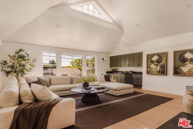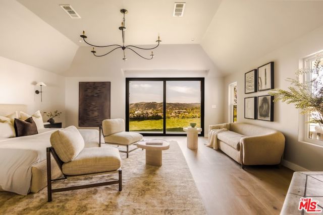 A completely reimagined Cape-Mod with soaring ceiling heights and incredible views, sitting on over 18,000 sqft of lush grounds. Five bedrooms and six baths, all en suite. Open floor plan with kitchen, living, and dining flowing together under vaulted ceilings with skylights, overlooking the pool and canyon. Strong natural light throughout with standout sunset views. Primary suite on the main level with walk-in closet and travertine fireplace, plus a generous guest bedroom with a storybook window nook. Upstairs includes three bedrooms plus a game room, family room, and private office.Gated and private with a two-car garage. Grounds feature a kidney-shaped pool, entertaining areas, and a large lower yard running the length of the lot - ideal for sports or a future pickleball court.