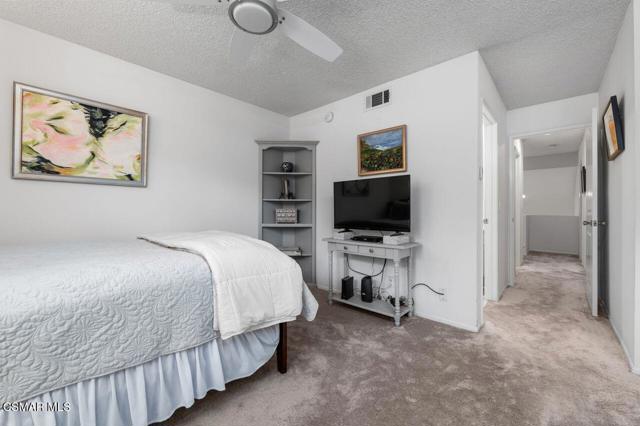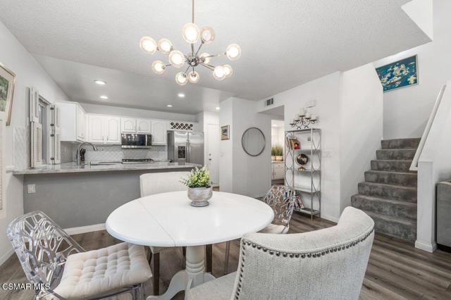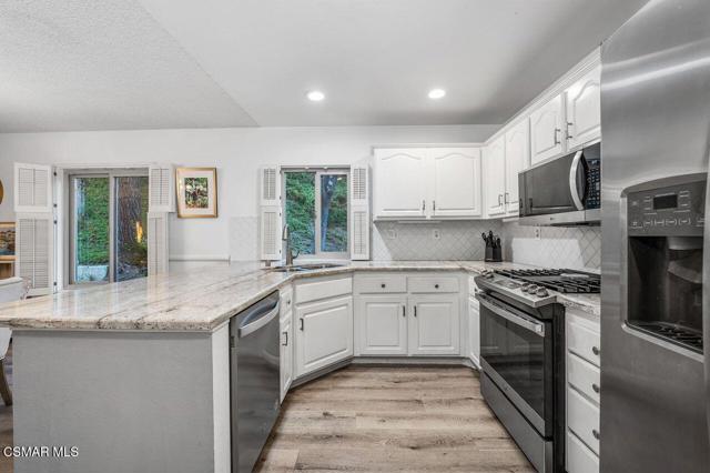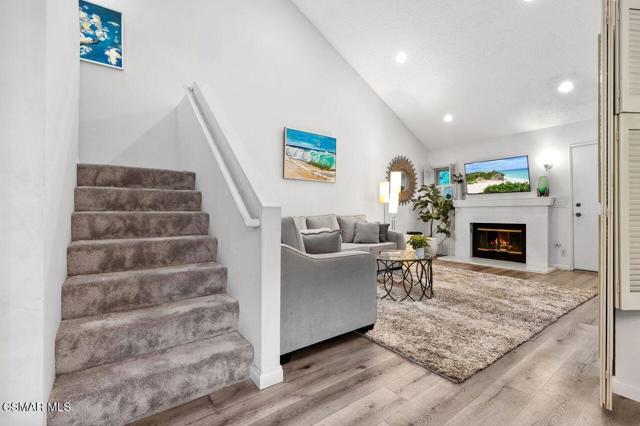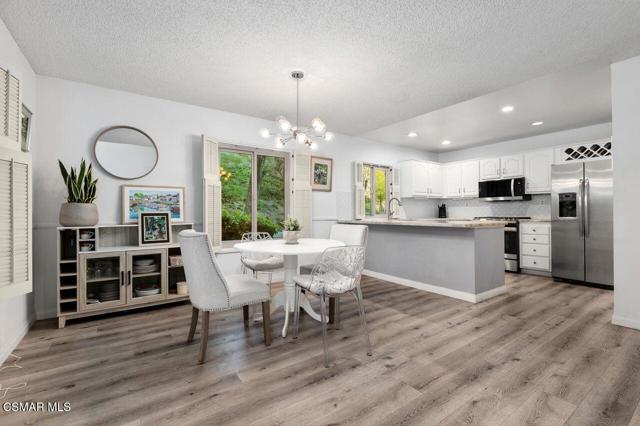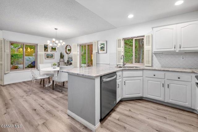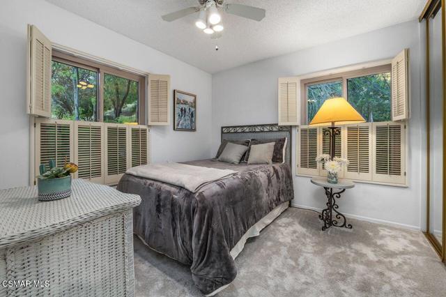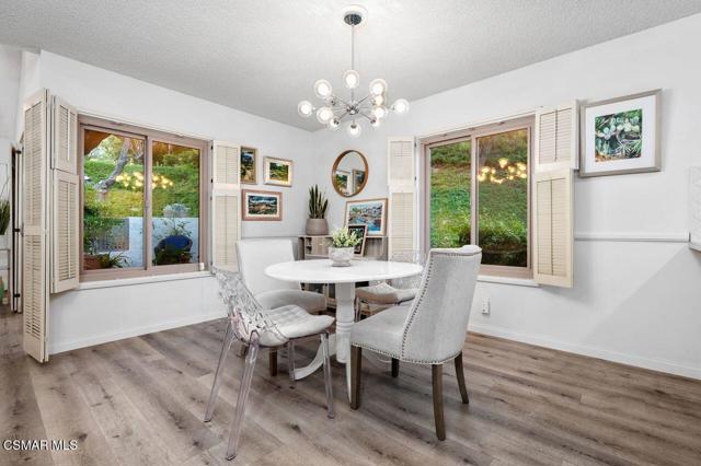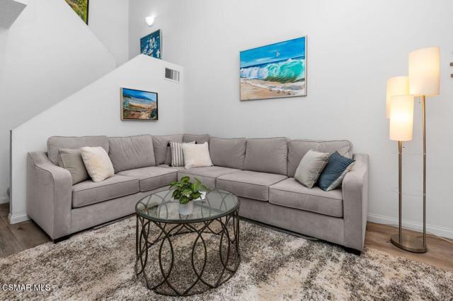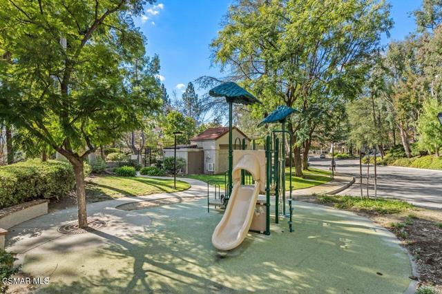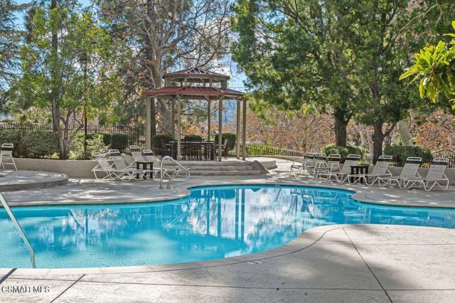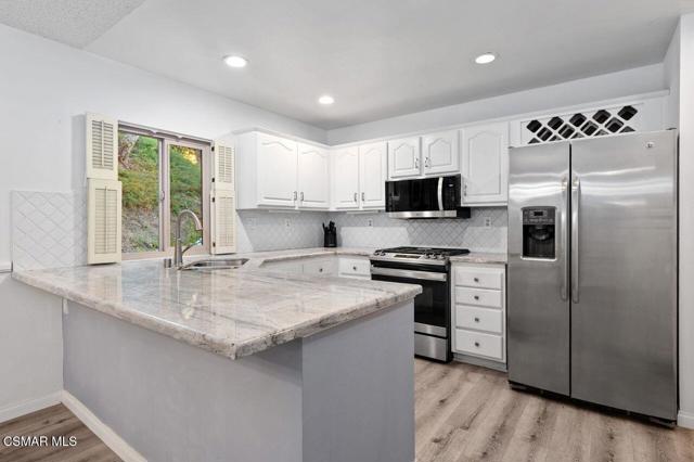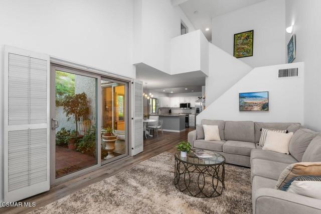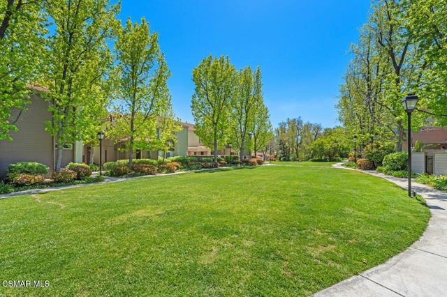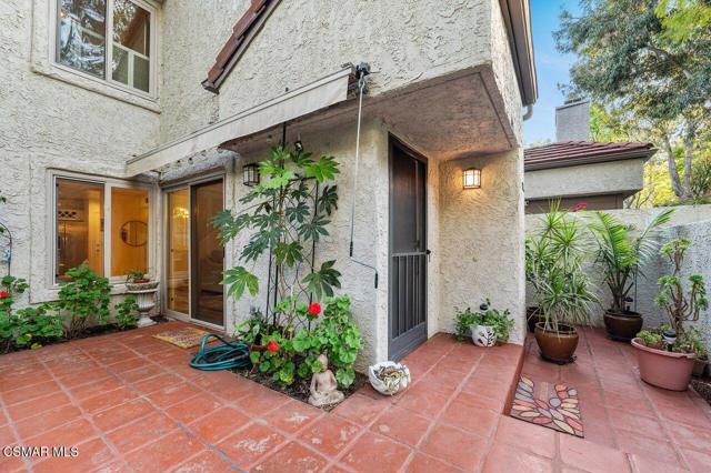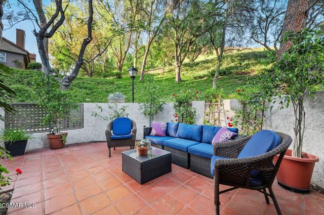Premiere end-unit 3 bedroom, 2.5 bath townhome in the highly sought-after Hidden Canyon community. This rare offering features an expansive wraparound patio--one of the largest in the neighborhood--surrounded by mature trees, mountain views, and exceptional privacy. A truly peaceful indoor-outdoor living experience.Inside, the home is filled with natural light and enhanced by newer dual-paned windows, luxury wood-like flooring, vaulted ceilings, and recessed lighting. The remodeled kitchen includes granite counters, custom cabinetry, stainless steel appliances, and a convenient breakfast bar, opening to the dining area and serene patio views.All three bedrooms are located upstairs, including a generous primary suite with an ensuite bath featuring a beautifully remodeled shower. All bathrooms have been remodeled. New carpet throughout the upper level adds comfort and freshness, and both secondary bedrooms enjoy great light and views.An attached two-car garage with direct access provides everyday convenience. A rare combination of privacy, views, and upgraded living in one of Westlake Village's most desirable townhome communities. Hidden Canyon offers multiple pools, spas, greenbelts, and close proximity to top-rated schools, hiking trails, and local amenities.