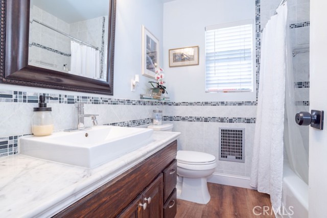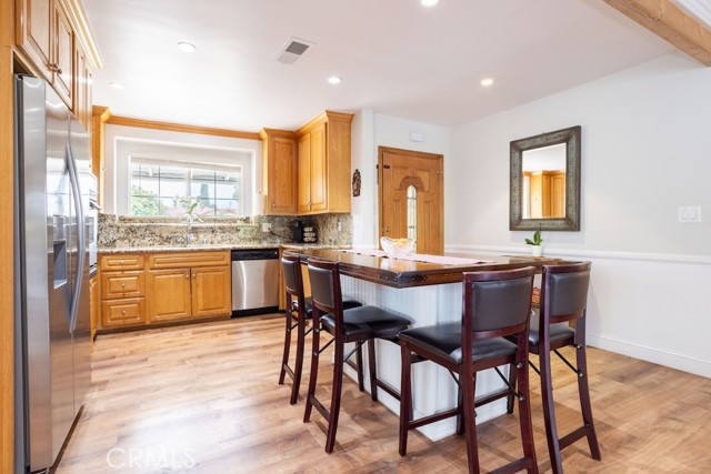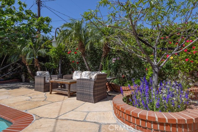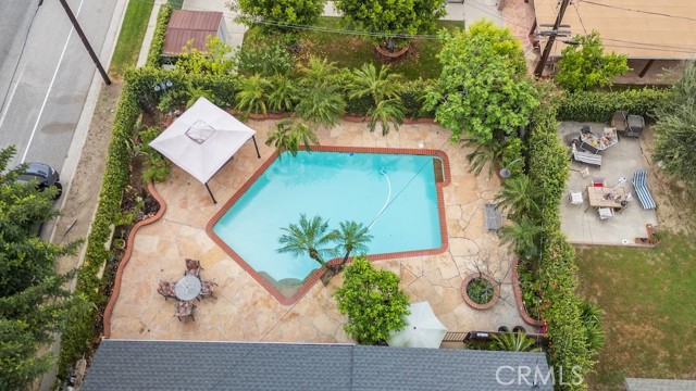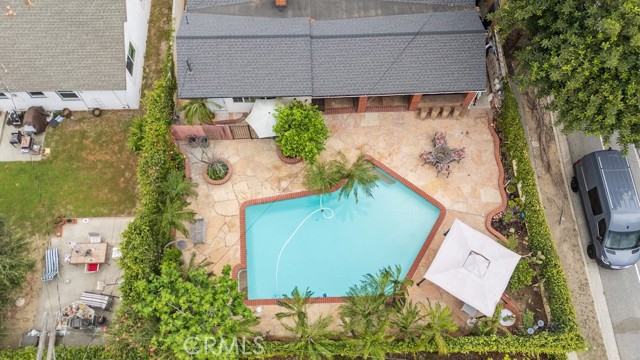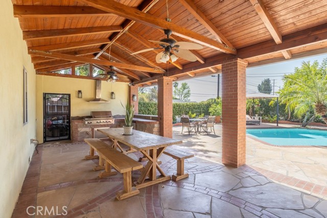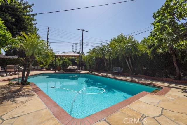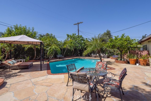 Welcome to this stunning Northridge residence, a 3 bedroom, 2 bathroom home that perfectly blends elegance, comfort, and functionality. Situated on a desirable corner lot, the property is fully fenced with stately red brick pillars and decorative iron gates. Automatic gates open to a secured flagstone driveway and lead to the spacious, finished 2-car garage. The corner location offers ample street parking and the convenience of two separate entryways. Step inside to be greeted by an inviting open concept design that effortlessly connects the kitchen, formal dining area, and living room. Warm, wood-like flooring flows throughout, creating a cohesive and welcoming atmosphere. The updated kitchen is a chef’s delight with granite countertops, built in ovens, and a versatile island ideal for casual dining or entertaining. The living room, anchored by a cozy fireplace, opens directly to the backyard oasis. Off the kitchen, you’ll find a laundry area and an updated full bathroom, perfect for guests or extended family. Down the hall are three generously sized bedrooms and another modern full bath. The primary suite is bathed in natural light and features dual closets for abundant storage. Adjacent to the formal dining area is a permitted living room flex space currently transformed into a charming studio. This versatile area boasts vaulted wood beam ceilings, Spanish tile floors, a kitchenette, private bathroom, and its own separate entry, along with a private patio accessible via the side yard. This space is ideal for extended family, a home office, or easy conversion back to a living room. The backyard is a true entertainer’s paradise. It features a sparkling pool, soaring wood-beam patio cover, and flagstone flooring throughout. Enjoy a built-in BBQ with an exhaust fan, a stone island with bar stools, multiple seating areas, raised planters, mature trees, and accent lighting that brings the space to life in the evenings. Whether hosting summer parties or enjoying quiet evenings, this backyard is the perfect retreat. This Northridge gem combines versatile living spaces, thoughtful updates, and a backyard designed for year round enjoyment offering the ultimate California lifestyle. Close proximity to shopping at the Northridge Fashion Center that houses Portos, EoS Fitness (formally Golds Gym), Apple Store, AMC Theaters, Yard House, and Northridge Farmers Market to name a few. Amazing location, close to Cal State Northridge and major freeways.