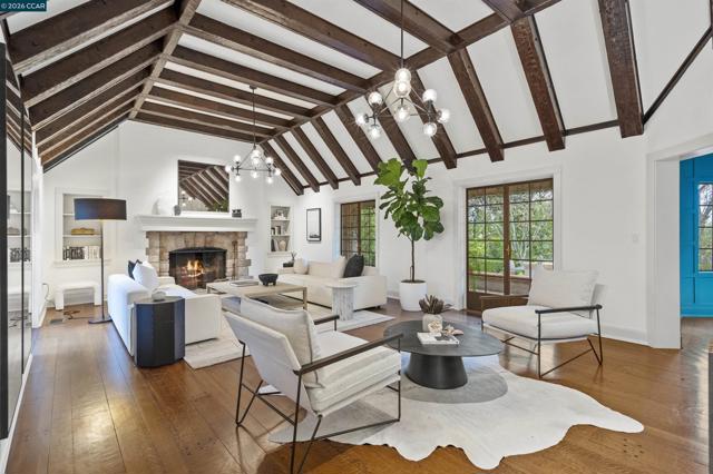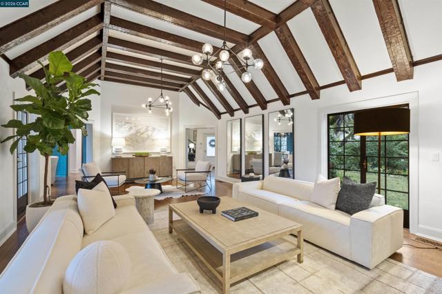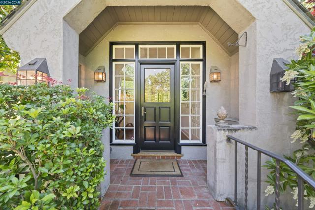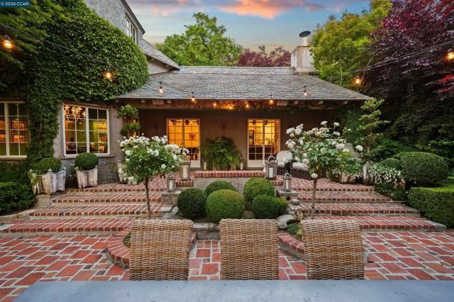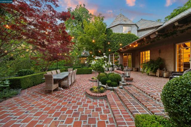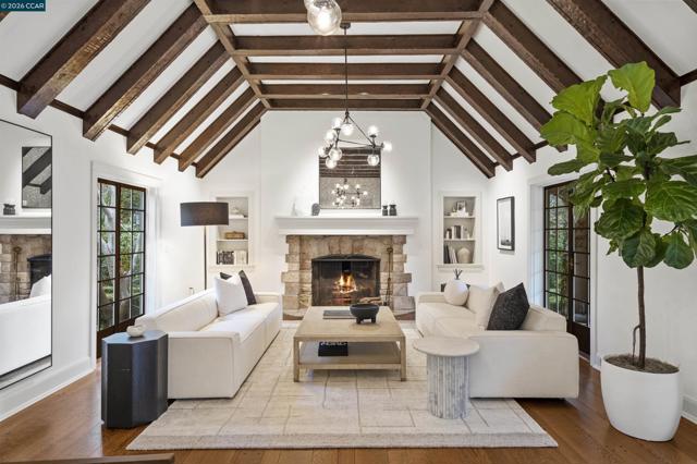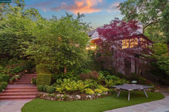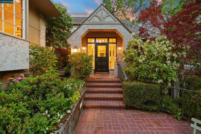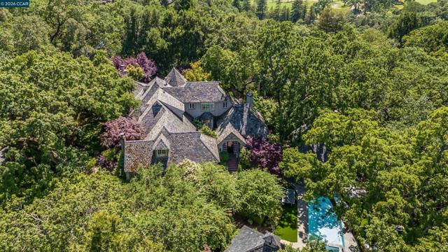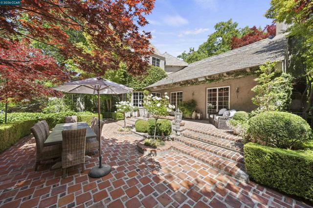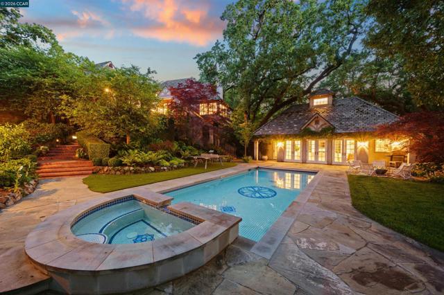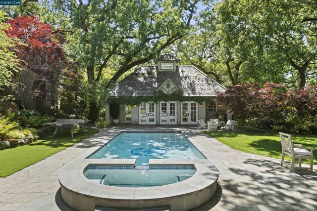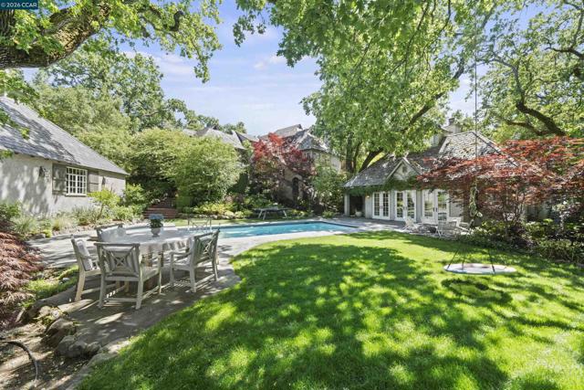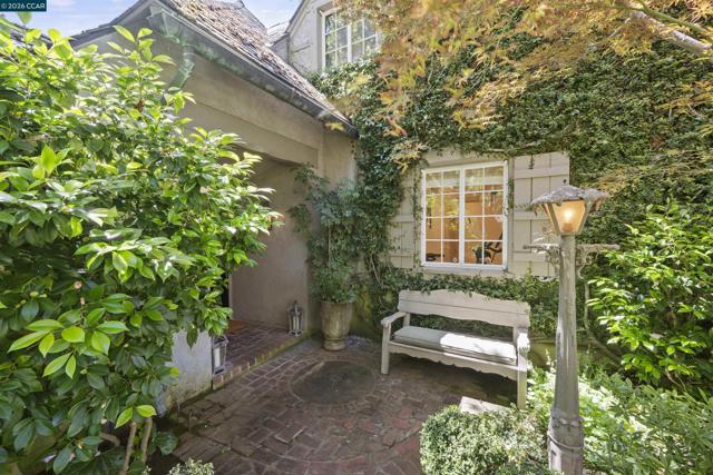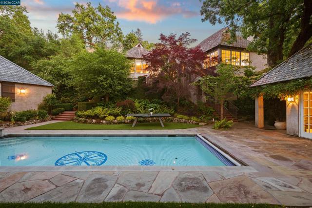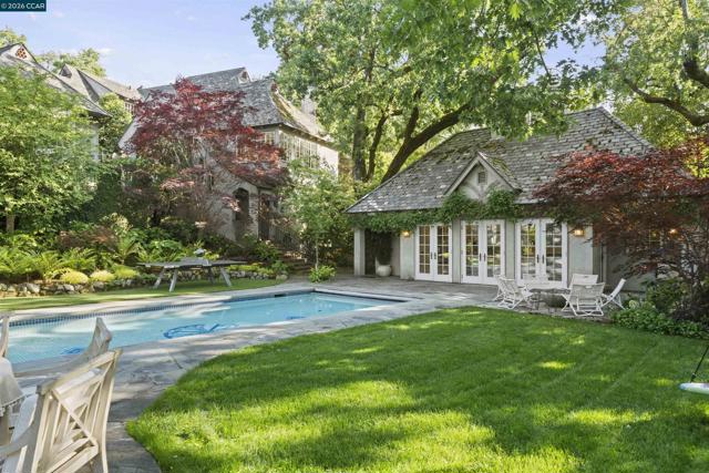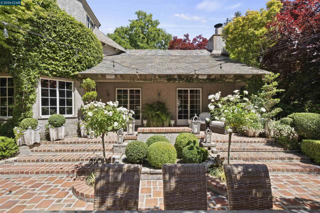 Designed in 1933 by Miller & Warnecke, this slate-roofed Tudor is one of Orinda Country Club's most enchanting estates — nestled among heirloom oaks, Japanese maples, and nearly year-round blooms. The soaring beamed living room features a wood-burning fireplace and French doors to a brick terrace with café lights. The 2022 chef's kitchen impresses with custom navy and oak cabinetry, marble countertops, Wolf range, Dacor double oven, Sub-Zero refrigerator, and Miele dishwasher, opening to a family room and informal dining. A butler's bar with pink quartzite and beverage fridge completes the entertaining flow. The primary suite offers a spa bath with freestanding tub, Waterworks fixtures, marble double vanity, and garden views. Three additional beds and 2.5 baths in the main house, plus a 741 sq ft 1 bed/1 bath pool house for guests or a studio. Outside: mosaic-tiled pool and spa, built-in fire pit, putting green, wine cellar, and meandering garden paths. Four fireplaces, a greenhouse shed, wine cellar, and bonus attic space. Minutes to OCC, downtown, BART, Hwy 24, and top-rated K–12 schools.