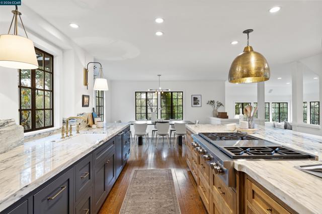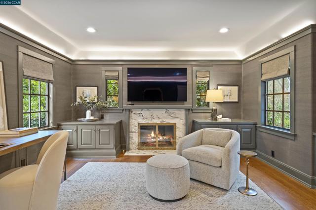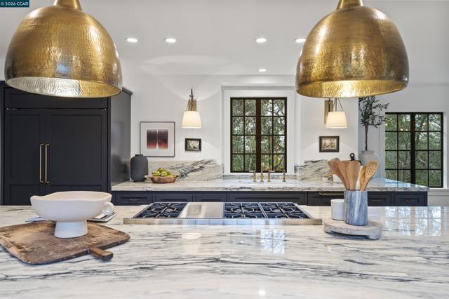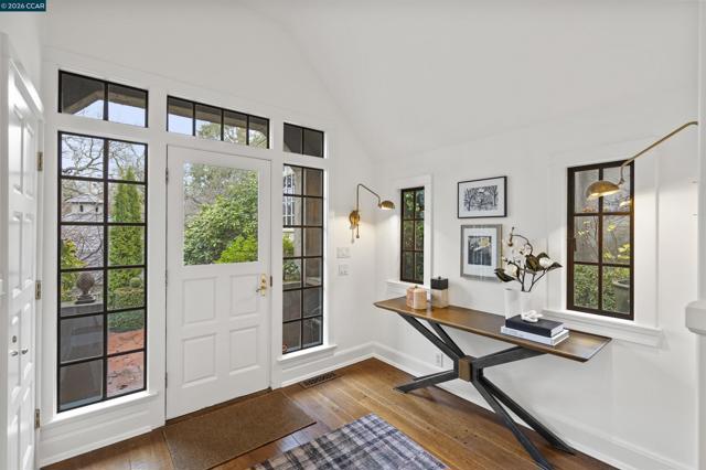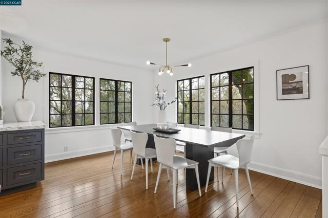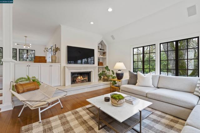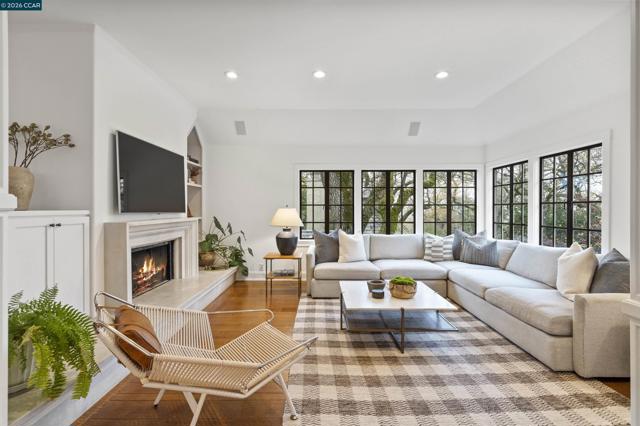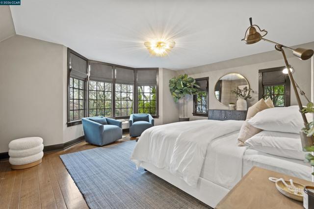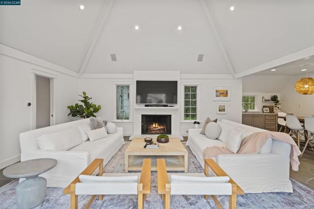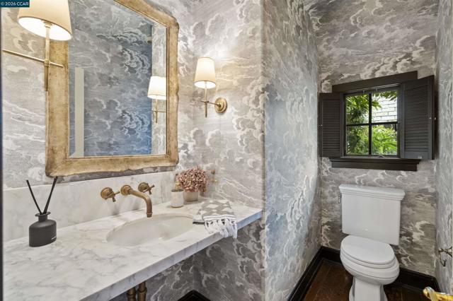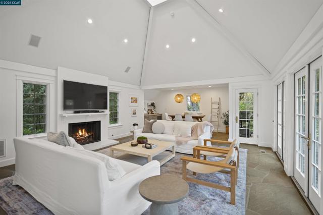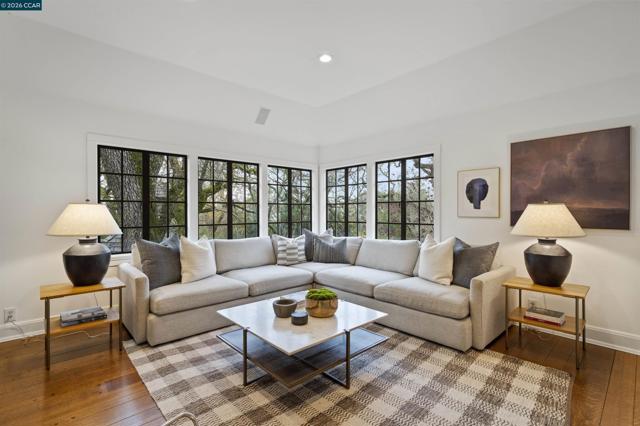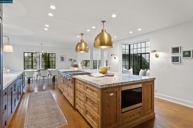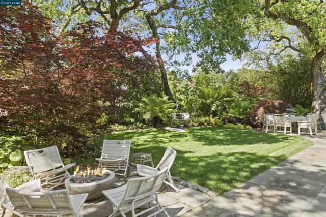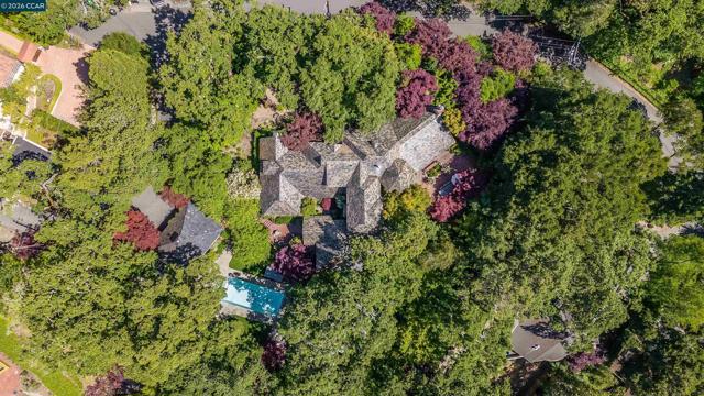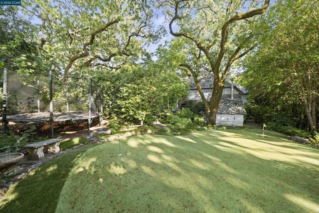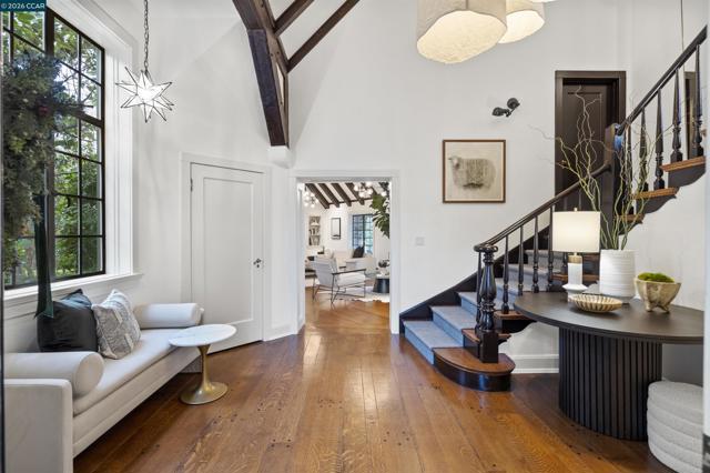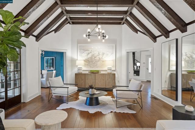 Designed in 1933 by Miller & Warnecke, this slate-roofed Tudor is one of Orinda Country Club's most enchanting estates — nestled among heirloom oaks, Japanese maples, and nearly year-round blooms. The soaring beamed living room features a wood-burning fireplace and French doors to a brick terrace with café lights. The 2022 chef's kitchen impresses with custom navy and oak cabinetry, marble countertops, Wolf range, Dacor double oven, Sub-Zero refrigerator, and Miele dishwasher, opening to a family room and informal dining. A butler's bar with pink quartzite and beverage fridge completes the entertaining flow. The primary suite offers a spa bath with freestanding tub, Waterworks fixtures, marble double vanity, and garden views. Three additional beds and 2.5 baths in the main house, plus a 741 sq ft 1 bed/1 bath pool house for guests or a studio. Outside: mosaic-tiled pool and spa, built-in fire pit, putting green, wine cellar, and meandering garden paths. Four fireplaces, a greenhouse shed, wine cellar, and bonus attic space. Minutes to OCC, downtown, BART, Hwy 24, and top-rated K–12 schools.