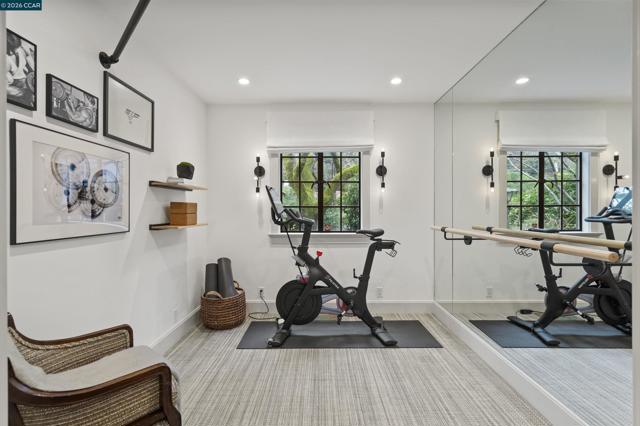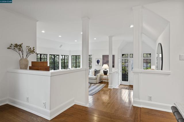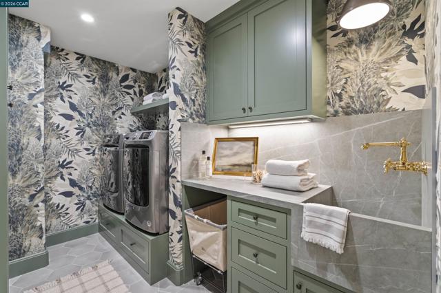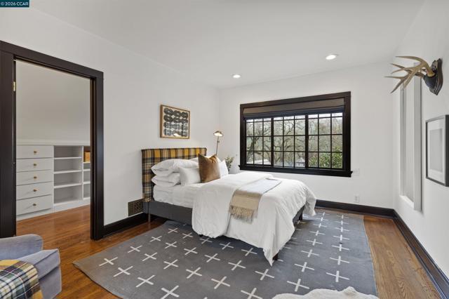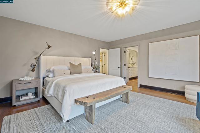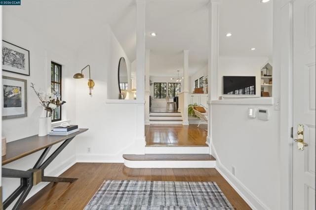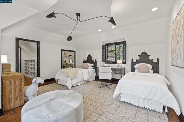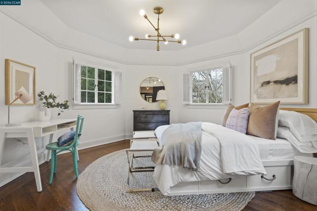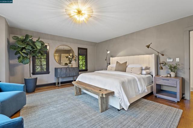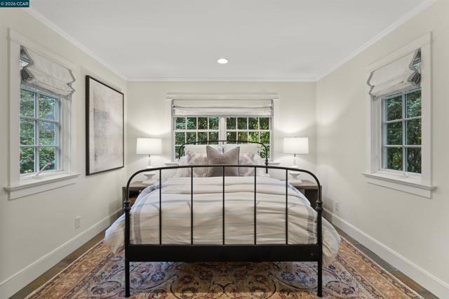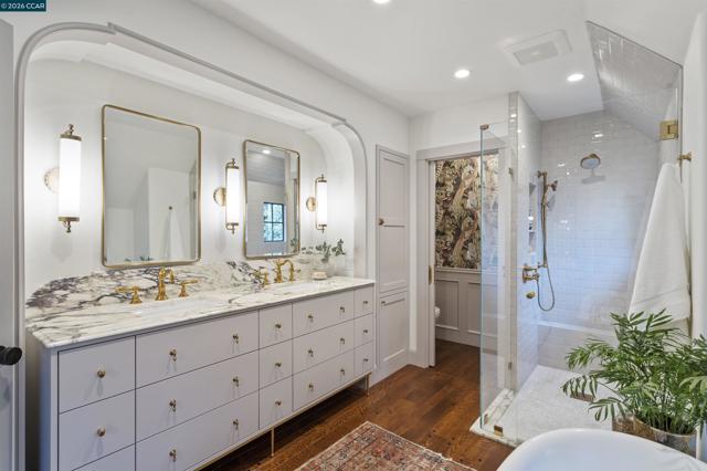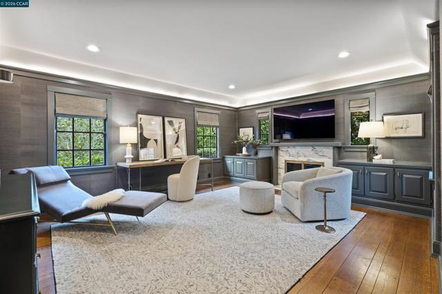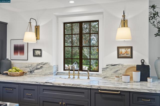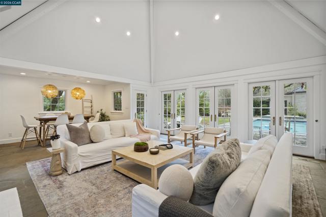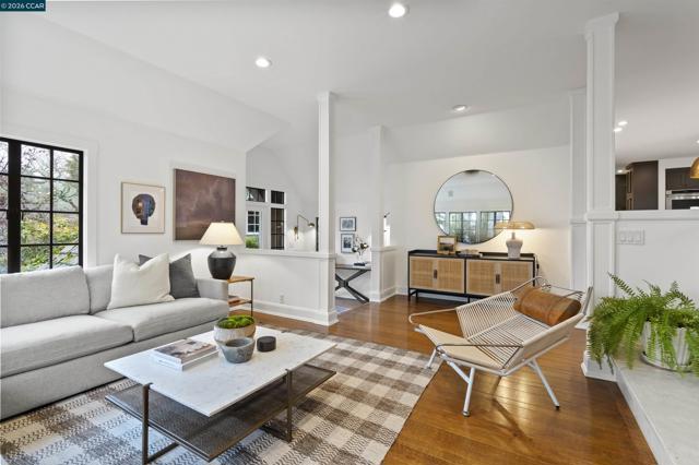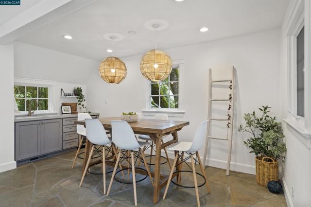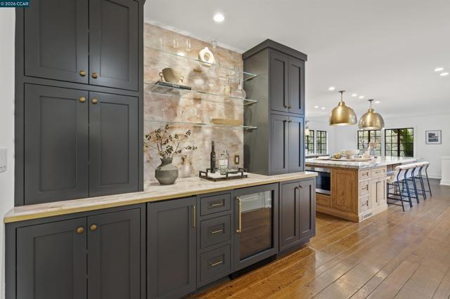 Designed in 1933 by Miller & Warnecke, this slate-roofed Tudor is one of Orinda Country Club's most enchanting estates — nestled among heirloom oaks, Japanese maples, and nearly year-round blooms. The soaring beamed living room features a wood-burning fireplace and French doors to a brick terrace with café lights. The 2022 chef's kitchen impresses with custom navy and oak cabinetry, marble countertops, Wolf range, Dacor double oven, Sub-Zero refrigerator, and Miele dishwasher, opening to a family room and informal dining. A butler's bar with pink quartzite and beverage fridge completes the entertaining flow. The primary suite offers a spa bath with freestanding tub, Waterworks fixtures, marble double vanity, and garden views. Three additional beds and 2.5 baths in the main house, plus a 741 sq ft 1 bed/1 bath pool house for guests or a studio. Outside: mosaic-tiled pool and spa, built-in fire pit, putting green, wine cellar, and meandering garden paths. Four fireplaces, a greenhouse shed, wine cellar, and bonus attic space. Minutes to OCC, downtown, BART, Hwy 24, and top-rated K–12 schools.