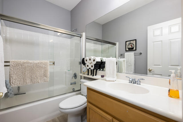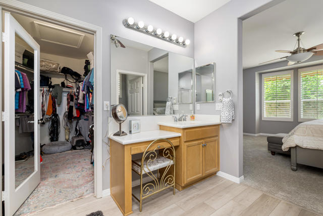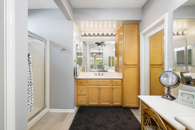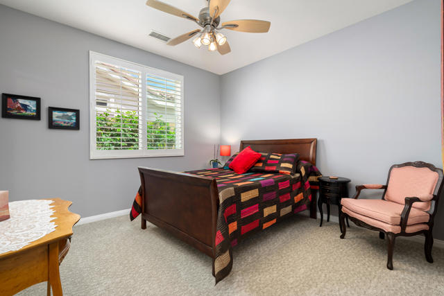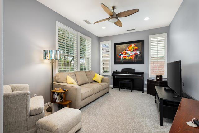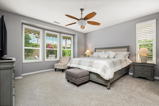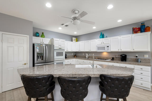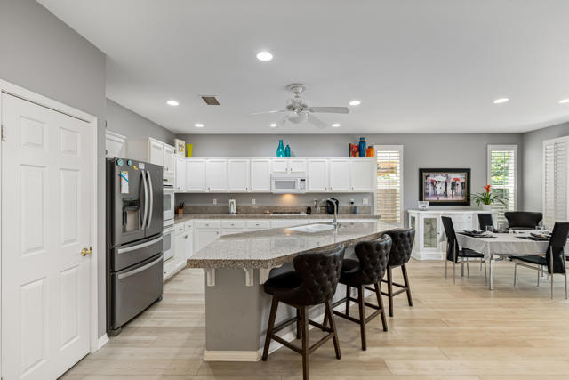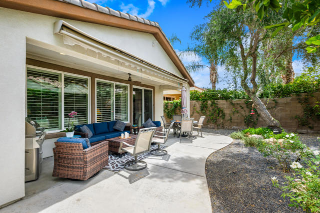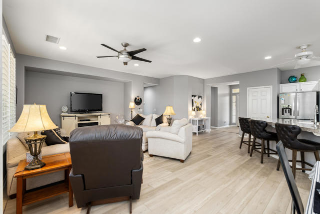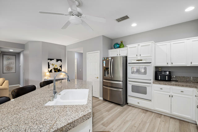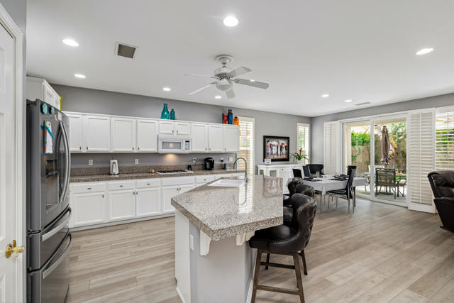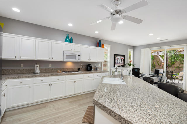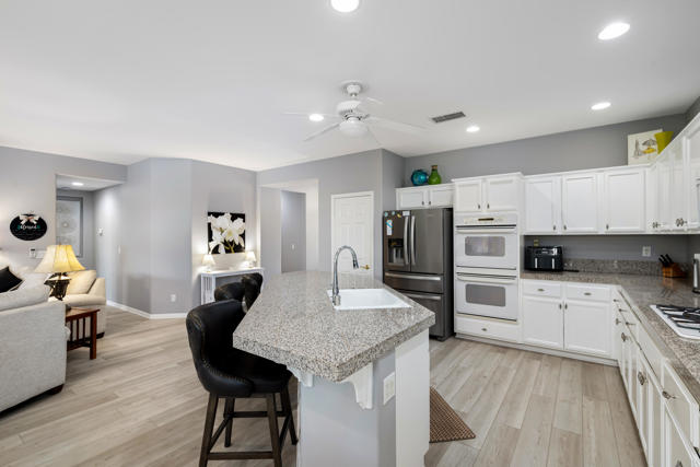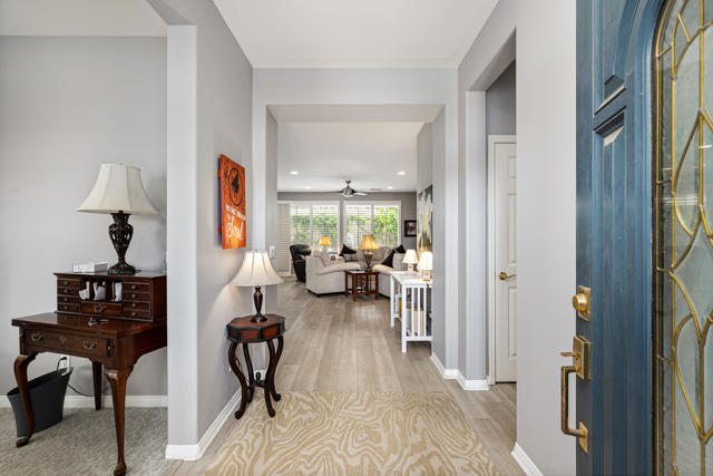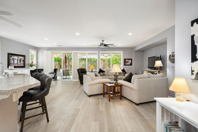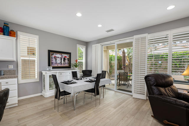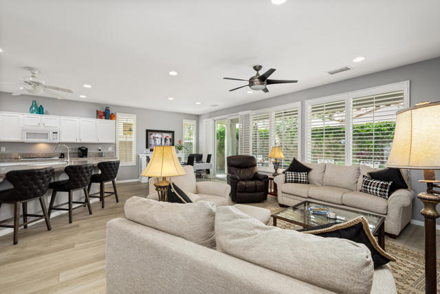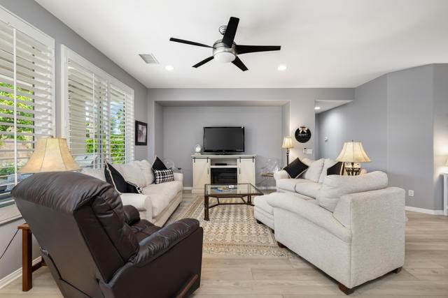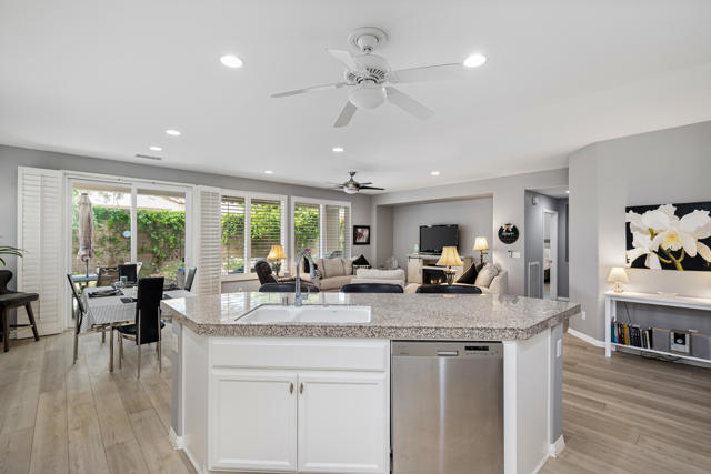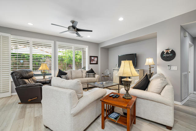 Bright, fresh and beautifully updated, this lovely Monterey model home in the 55+ Trilogy at La Quinta and Golf Club is pure delight. At 1,693 square feet, with 2 bedrooms, 2 baths, and a den or potential third bedroom, the Monterey is prized for its high ceilings, open and flexible floor plan, spacious and well-organized kitchen with an abundance of cabinets, counterspace, impressive island, dining area, and great room. What makes this home outstanding is the new grey washed wide-plank flooring, expansive white kitchen cabinets, exquisite slab granite countertops, and freshly painted interior. Large picture windows in the great room and primary bedroom with white shutters overlook the private covered patio and handsomely landscaped backyard with soothing water fountain. Day and night the home offers the ultimate comfort and relaxation.Perfect for both casual dining and serious cooking, the kitchen has everything you need to dine and entertain. The kitchen is fitted with a double oven, natural gas cooktop, microwave, dishwasher, and new refrigerator. There's plenty of cabinets and a pantry to keep all your kitchen ware tucked neatly away. The kitchen and dining areas are open to the great room and the back patio, keeping you engaged with family and friends while cooking and entertaining. The primary bedroom suite is spacious, and the bathroom features dual vanities, a large walk-in shower, a linen closet, and large walk-in closet with mirrored door. The guest bedroom is roomy with a mirrored closet and is located next to a full guest bath. An oversized garage offers room for two vehicles side-by-side and a golf cart.