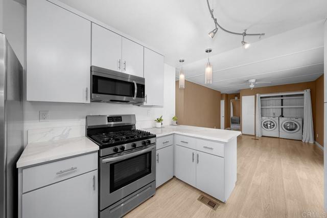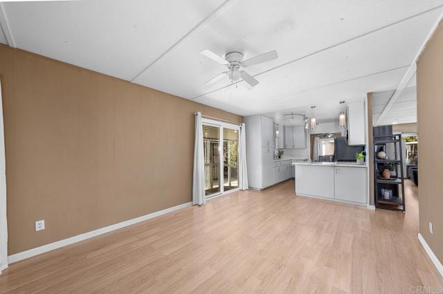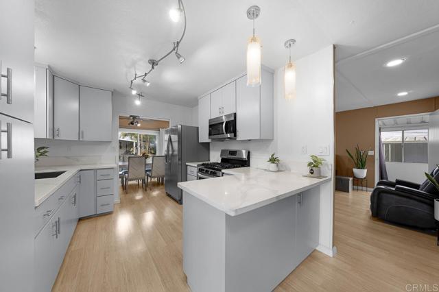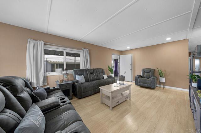 NEW KITCHEN. BONUS ROOM. OPEN FLOOR PLAN. NATURAL LIGHT. PRIVACY. Located in a quiet, private, and maintained 55+ community, this spacious two-bedroom home offers over 1,440 sq ft of living space with an open floor plan and flexible layout potential. The home features a brand-new kitchen with stainless steel refrigerator, range, oven, washer, dryer, and microwave included, along with carpet in the bedrooms and laminate flooring throughout the main living areas. A bright sunroom provides additional usable space for relaxing or entertaining. An additional storage shed is included, offering extra storage. There is also space to start a garden and plant your own fruits and vegetables. The carport accommodates up to three vehicles, with additional guest parking available within the community. Community amenities include a pool, pool room, clubhouse, and reading room, all set within a peaceful, well-kept environment in a convenient Chula Vista location.